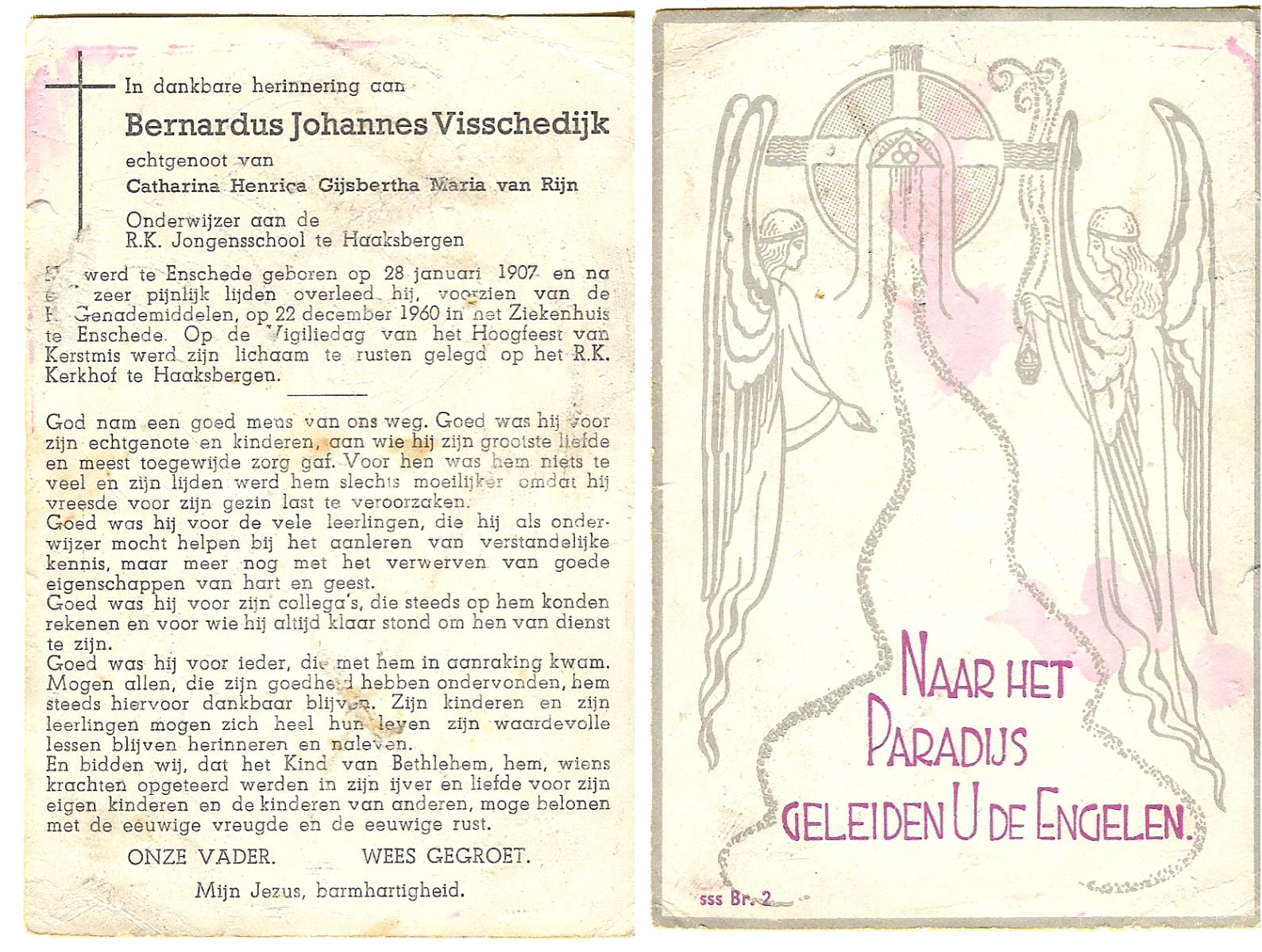 VISSCHEDIJK, Bernardus Johannes, geboren op 28-1-1907 te Enschede, overleden op 22-12-1960 te Enschede op 53-jarige leeftijd, begraven te Haaksbergen.