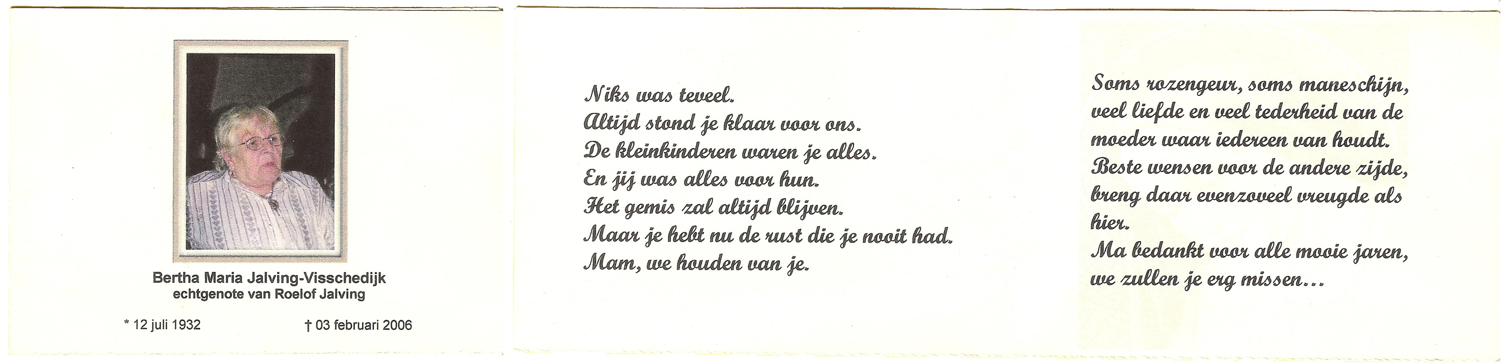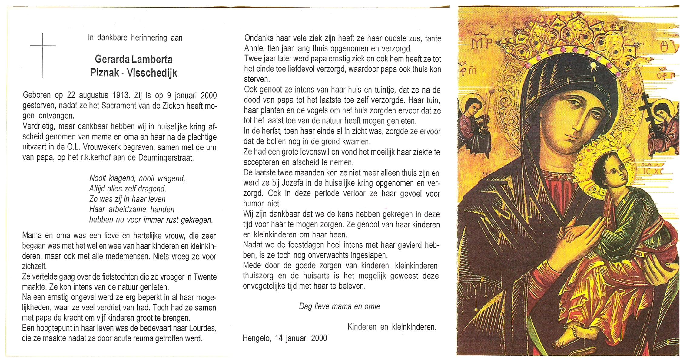 VISSCHEDIJK, Gerarda Lamberta, geboren op 22-8-1913, overleden op 9-1-2000 op 86-jarige leeftijd, begraven te Hengelo (Ov.).
