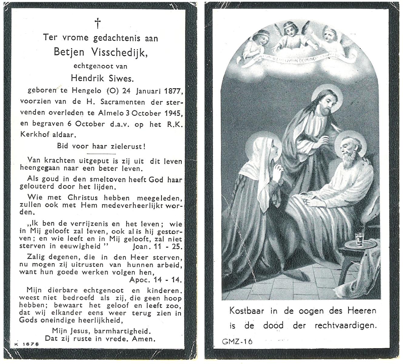 VISSCHEDIJK, Betjen, geboren op 24-01-1877 te Hengelo (O), overleden op 3-10-1945 te Almelo op 68-jarige leeftijd, begraven op 6-10-1945 te Almelo.