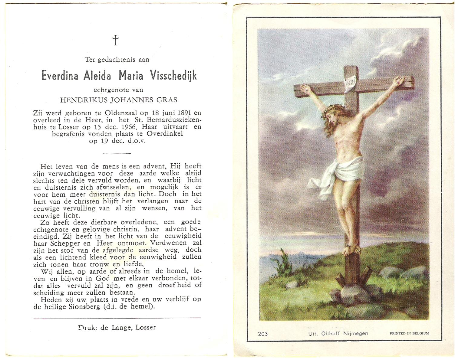 VISSCHEDIJK, Everdina Aleida Maria, geboren op 18-06-1891 te Oldenzaal, overleden op 15-12-1966 te Losser op 75-jarige leeftijd, begraven op 19-12-1966 te Losser.