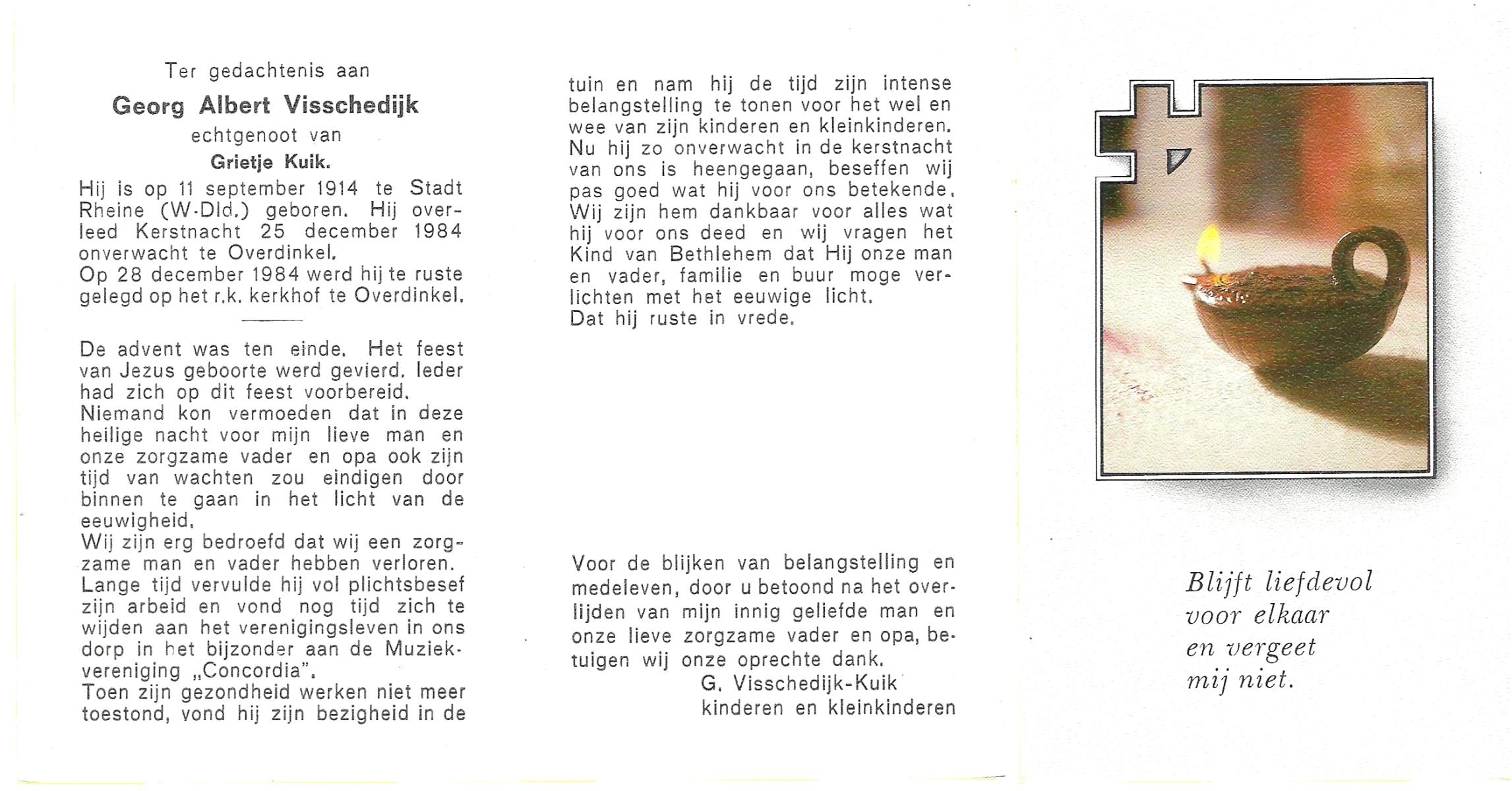 VISSCHEDIJK, Georg Albert, geboren op 11-9-1914 te Rheine, Stadt(D), overleden op 25-12-1984 te Overdinkel op 70-jarige leeftijd, begraven op 28-12-1984 te Overdinkel.
