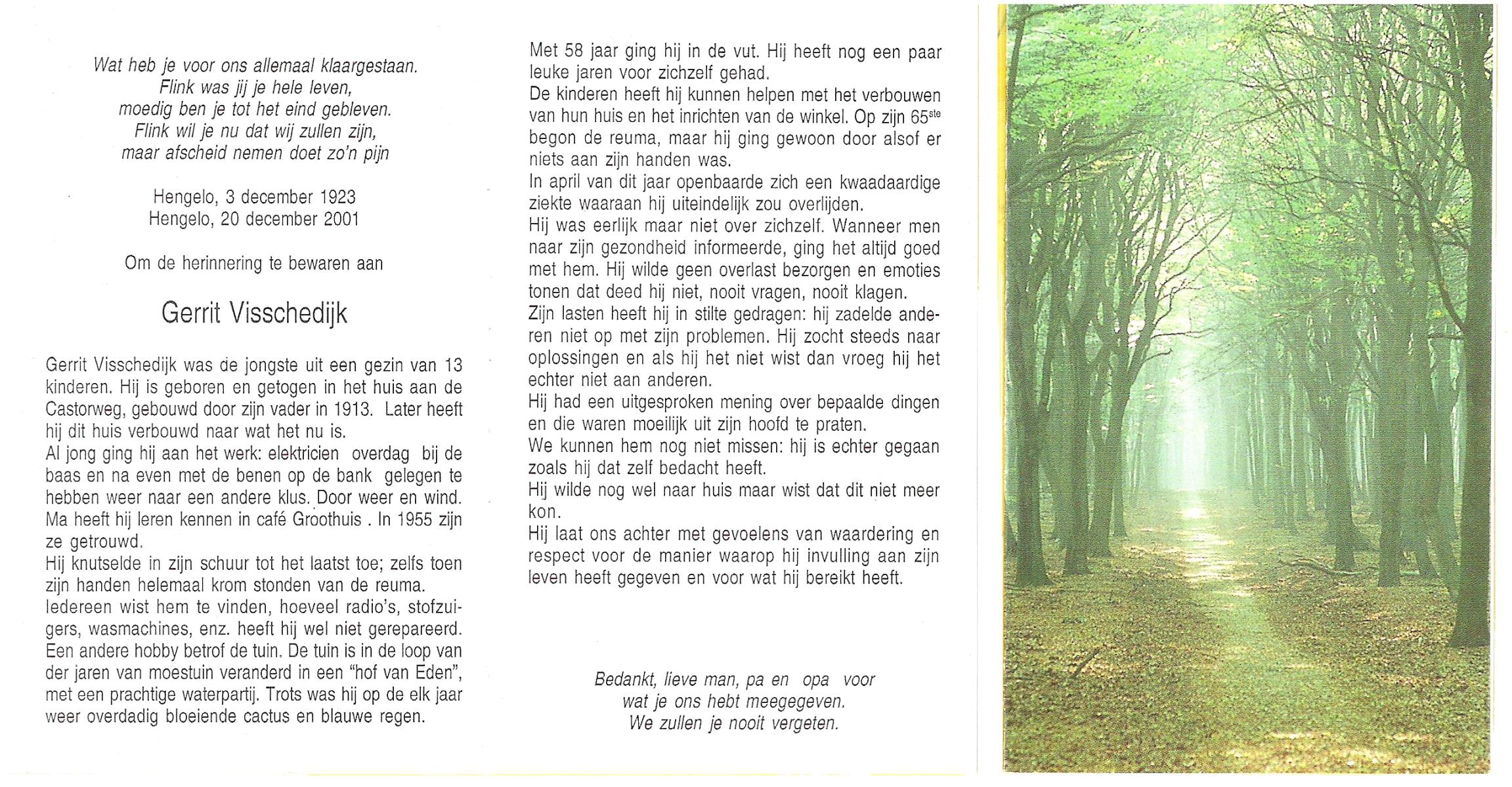 VISSCHEDIJK, Gerrit, geboren op 3-12-1923 te Hengelo (O), overleden op 20-12-2001 te Hengelo (Ov.) op 78-jarige leeftijd.