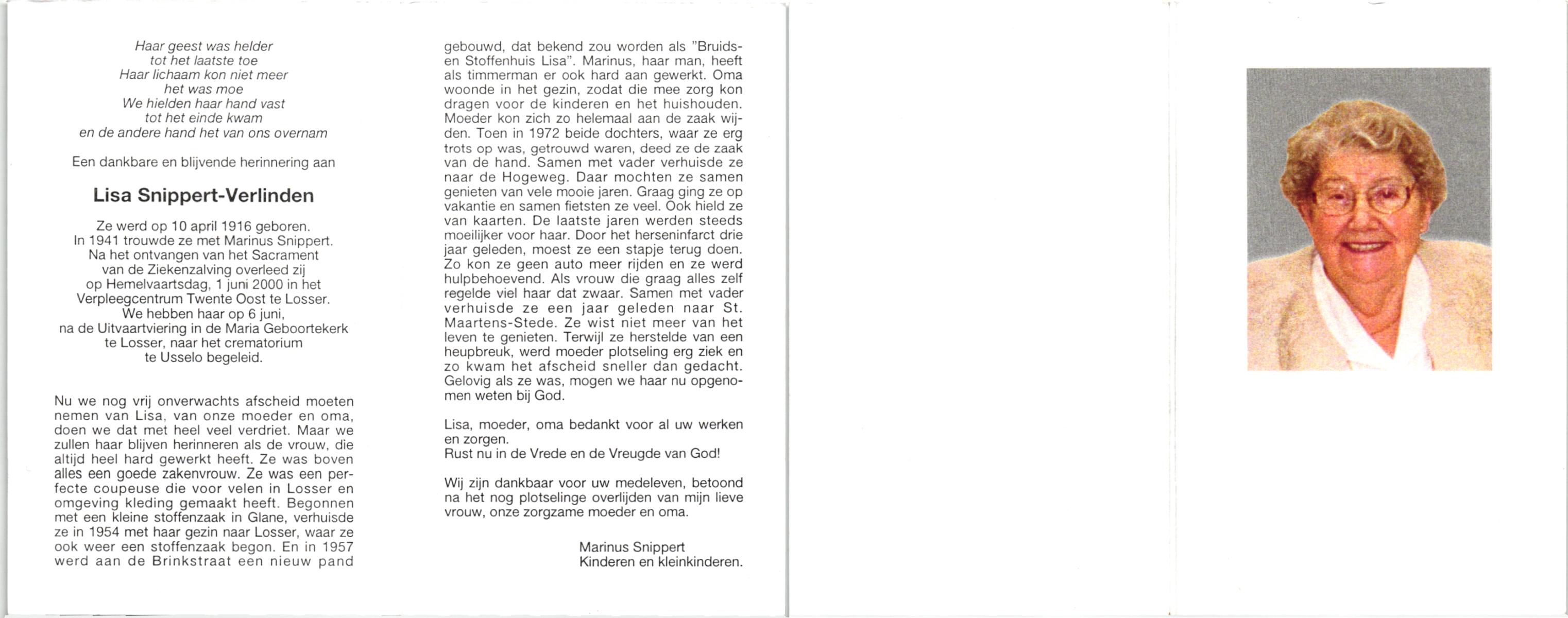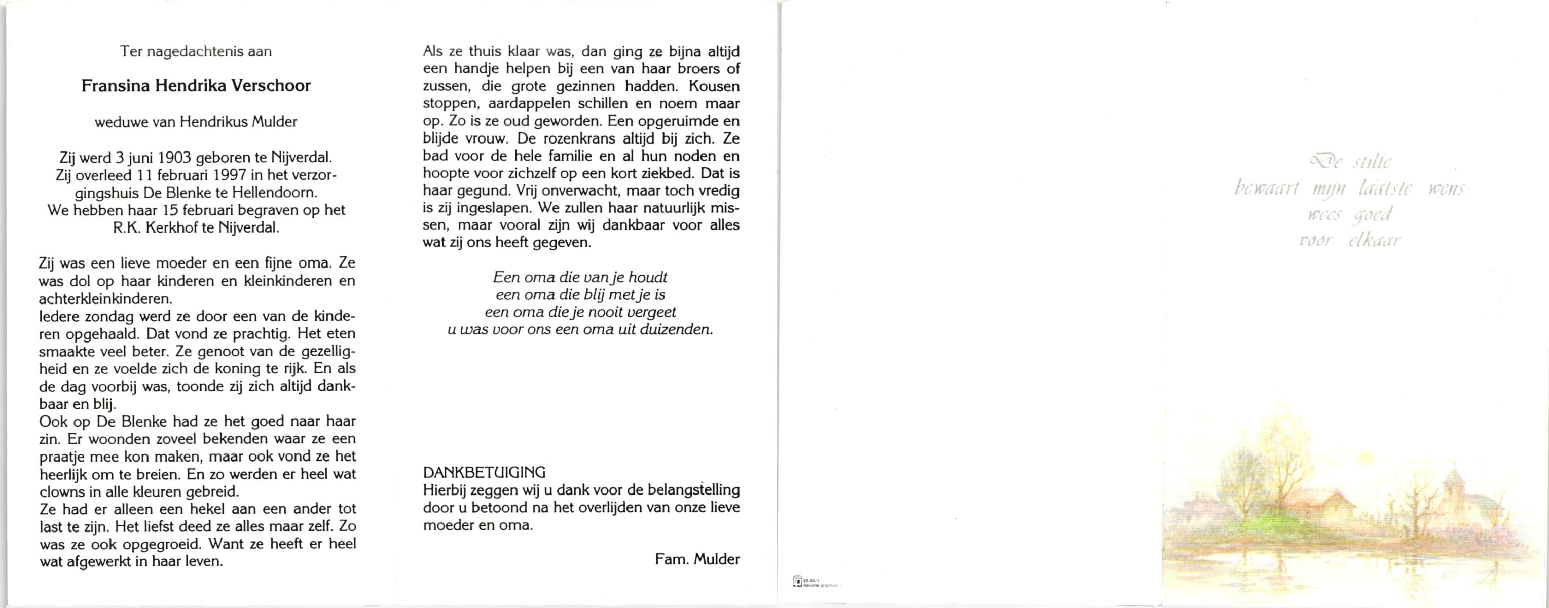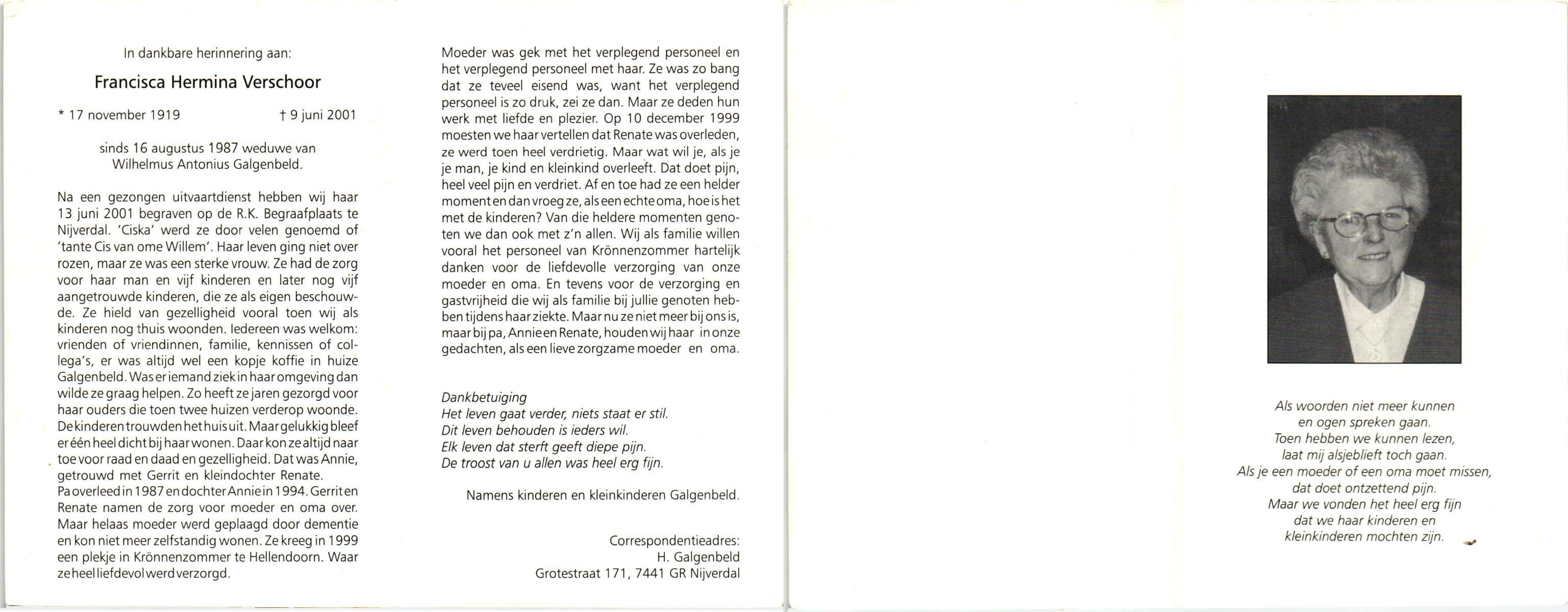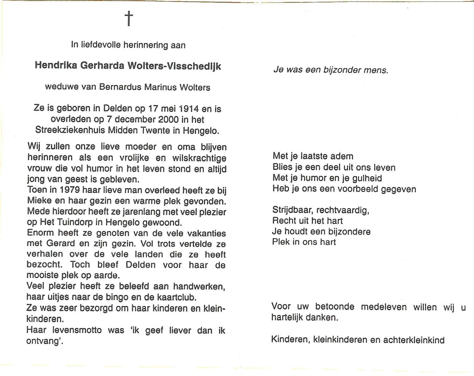 VISSCHEDIJK, Hendrika Gerharda, geboren op 17-5-1914 te Delden, overleden op 7-12-2000 te Hengelo (Ov.) op 86-jarige leeftijd.