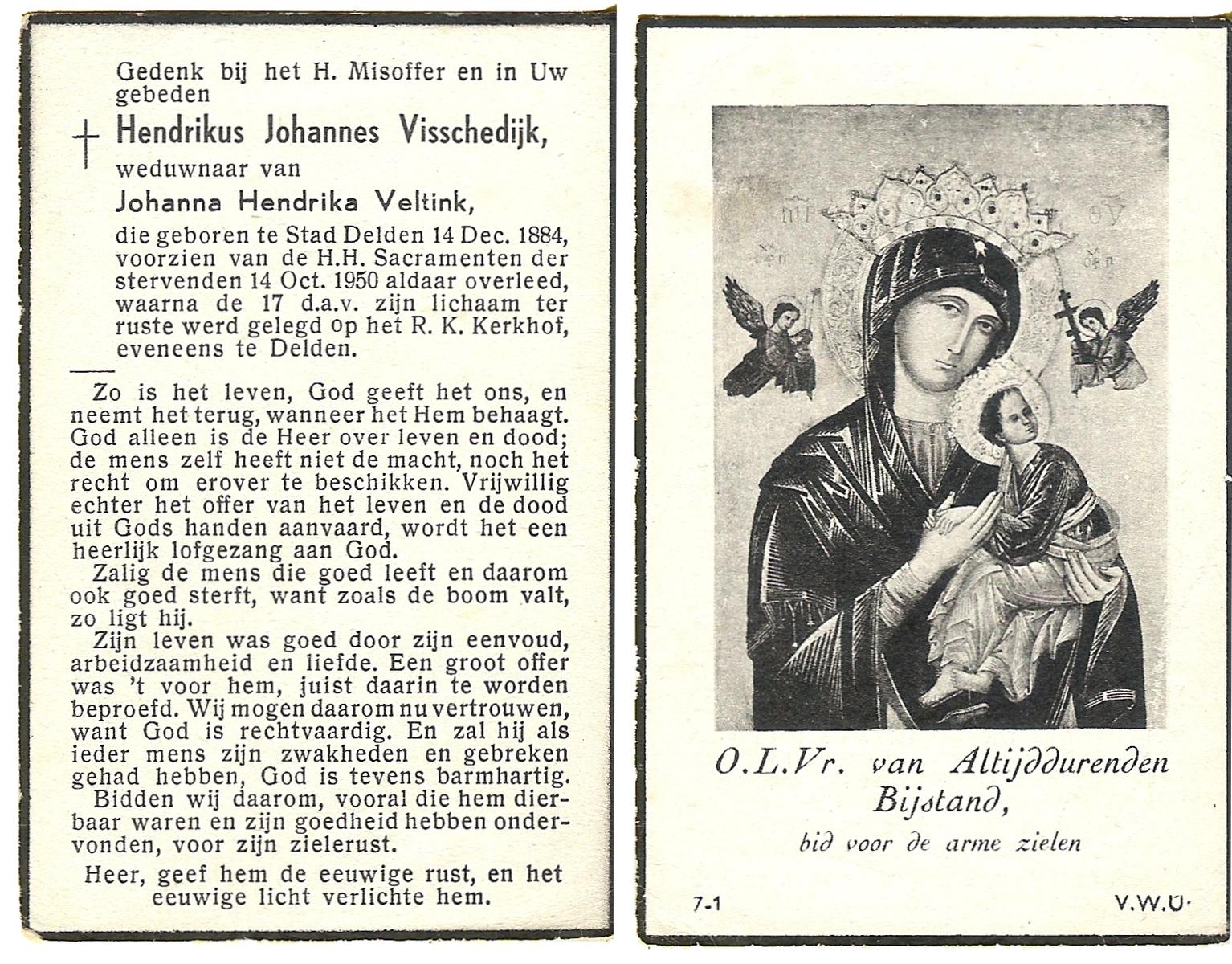 VISSCHEDIJK, Hendrikus Johannes, geboren op 14-12-1884 te Delden, Stad, overleden op 14-10-1950 op 65-jarige leeftijd, begraven op 17-10-1950 te Delden.