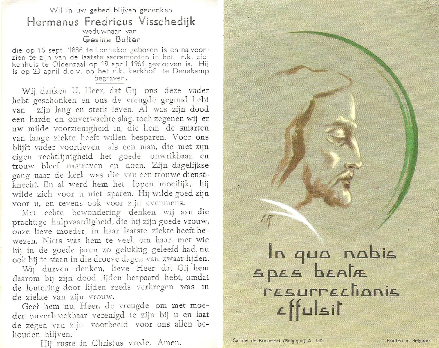 VISSCHEDIJK, Hermanus Fredricus, geboren op 16-09-1886 te Lonneker, overleden op 19-4-1964 te Oldenzaal op 77-jarige leeftijd, begraven op 23-4-1964 te Denekamp R.K.kerkhof.