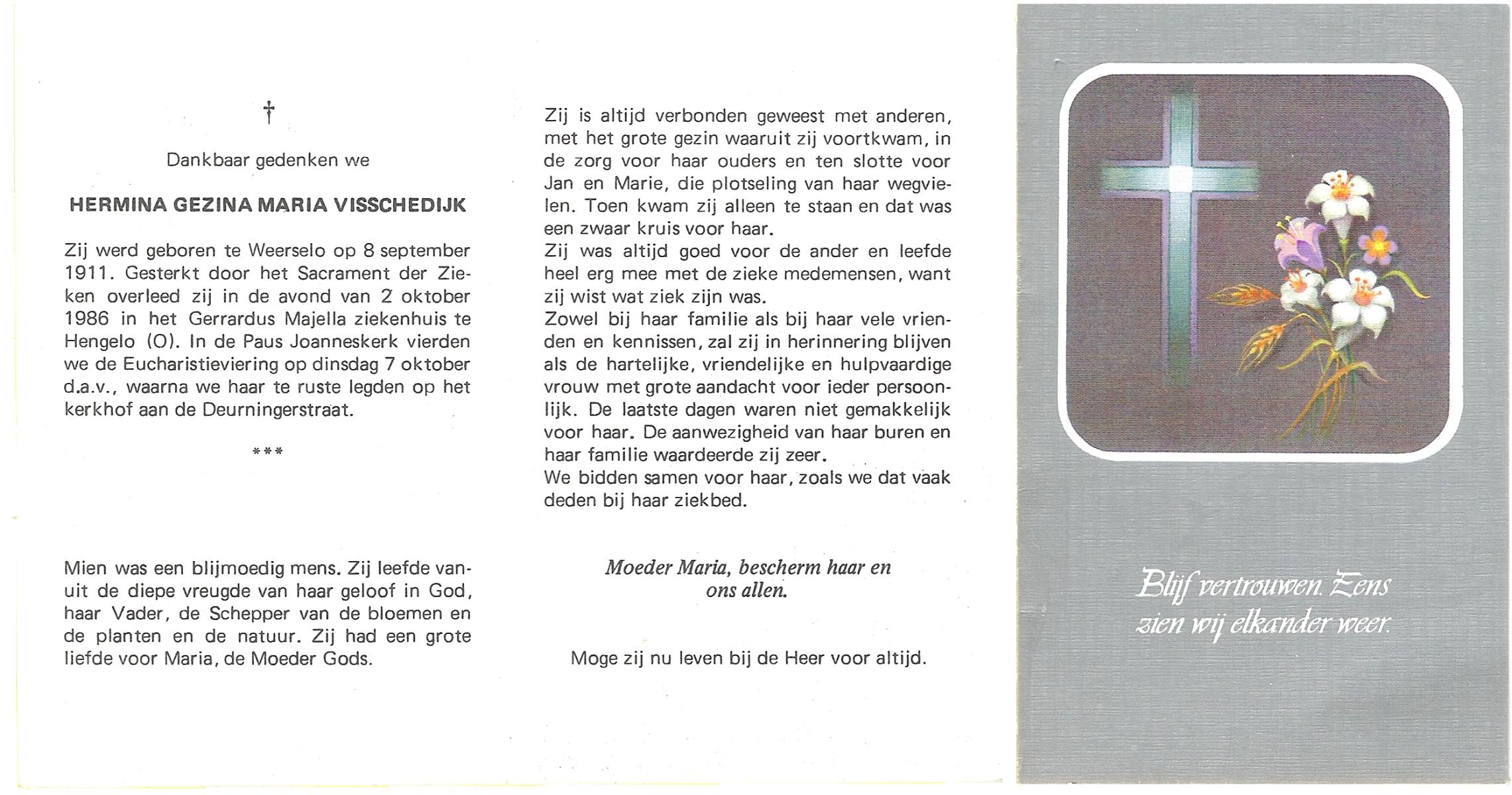VISSCHEDIJK, Hermina Gezina Maria, geboren op 8-9-1911 te Weerselo, overleden op 2-10-1986 te Hengelo (Ov.) op 75-jarige leeftijd, begraven op 7-10-1986 te Hengelo (Ov.).