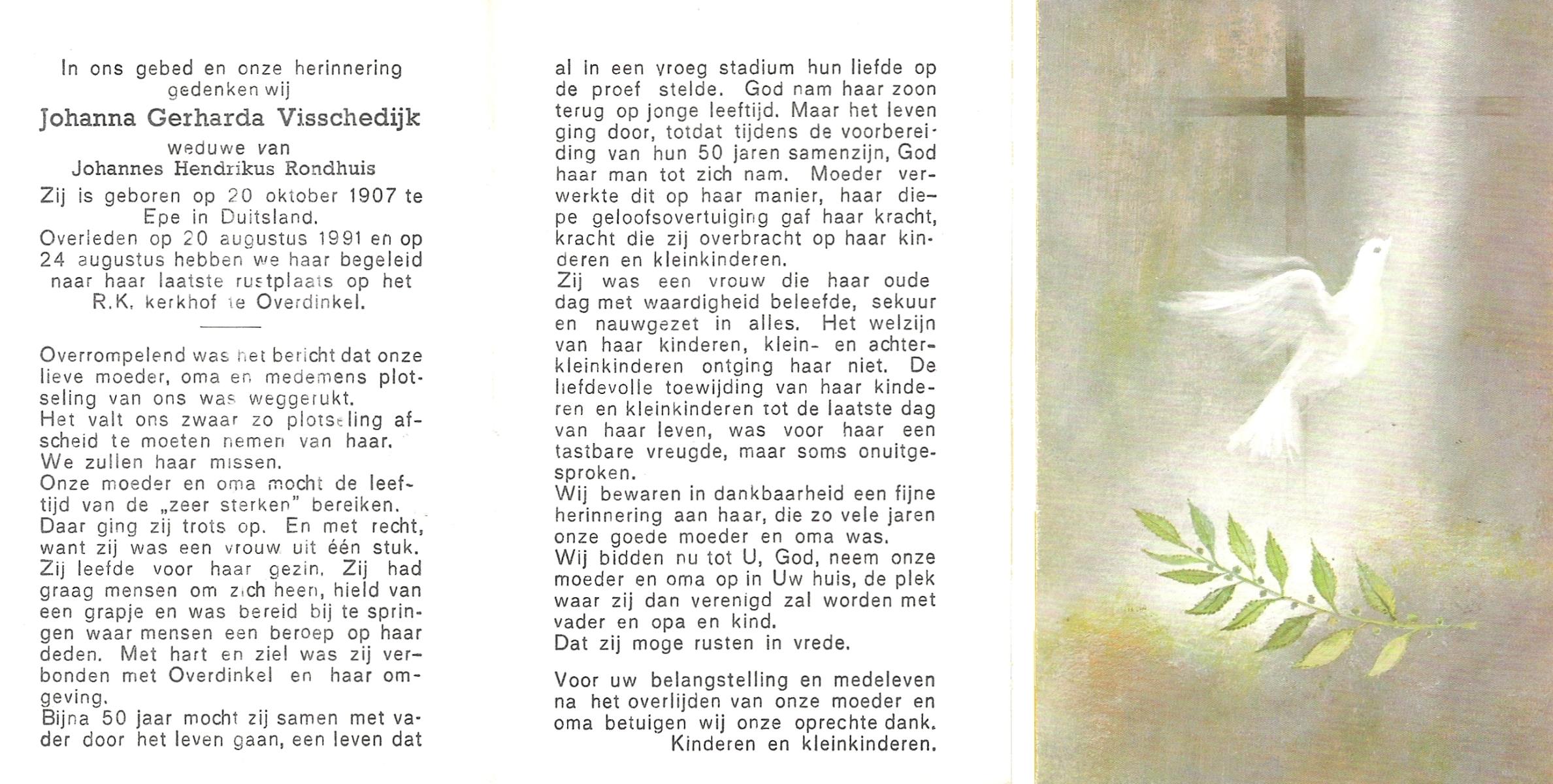 VISSCHEDIJK, Johanna Gerharda, geboren op 20-10-1907 te Epe (Dld), overleden op 20-8-1991 op 83-jarige leeftijd, begraven op 24-8-1991 te Overdinkel.
