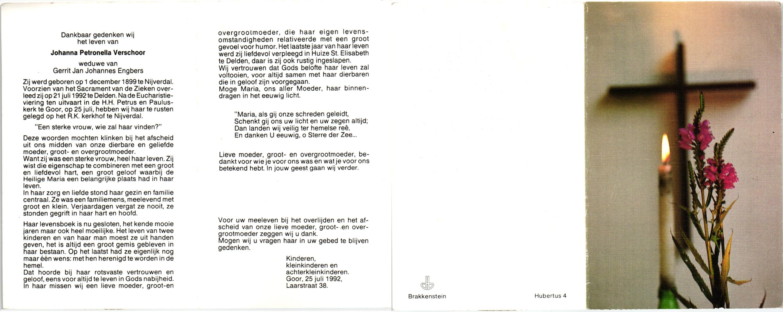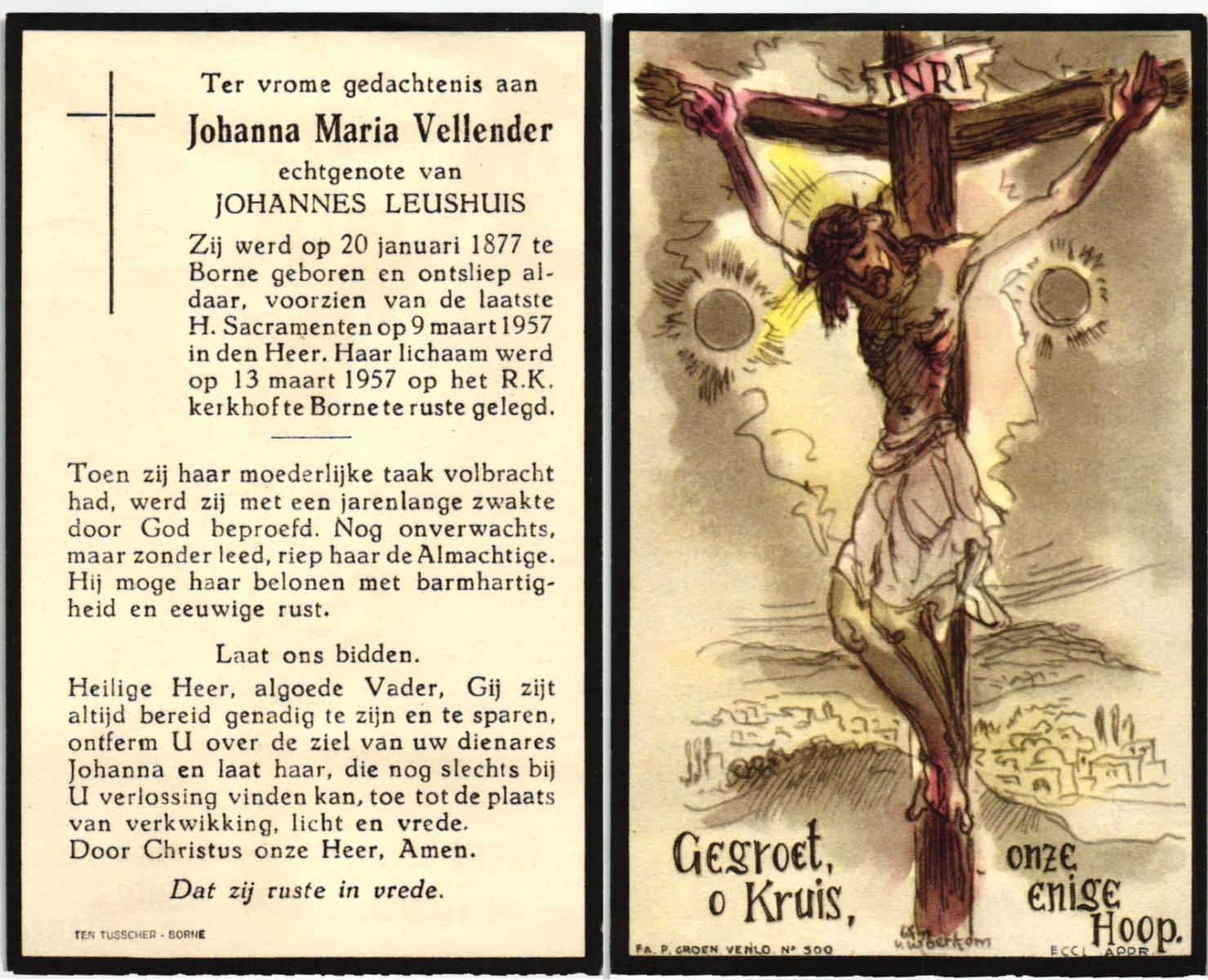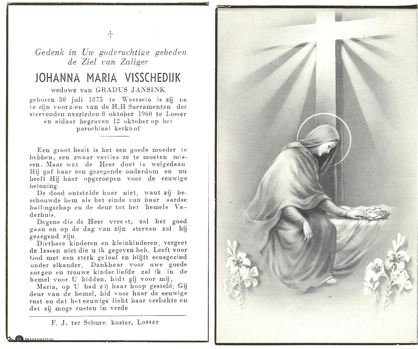 VISSCHEDIJK, Johanna Maria, geboren op 30-07-1875 te Weerselo, overleden op 8-10-1960 te Losser op 85-jarige leeftijd, begraven op 12-10-1960 te Losser.