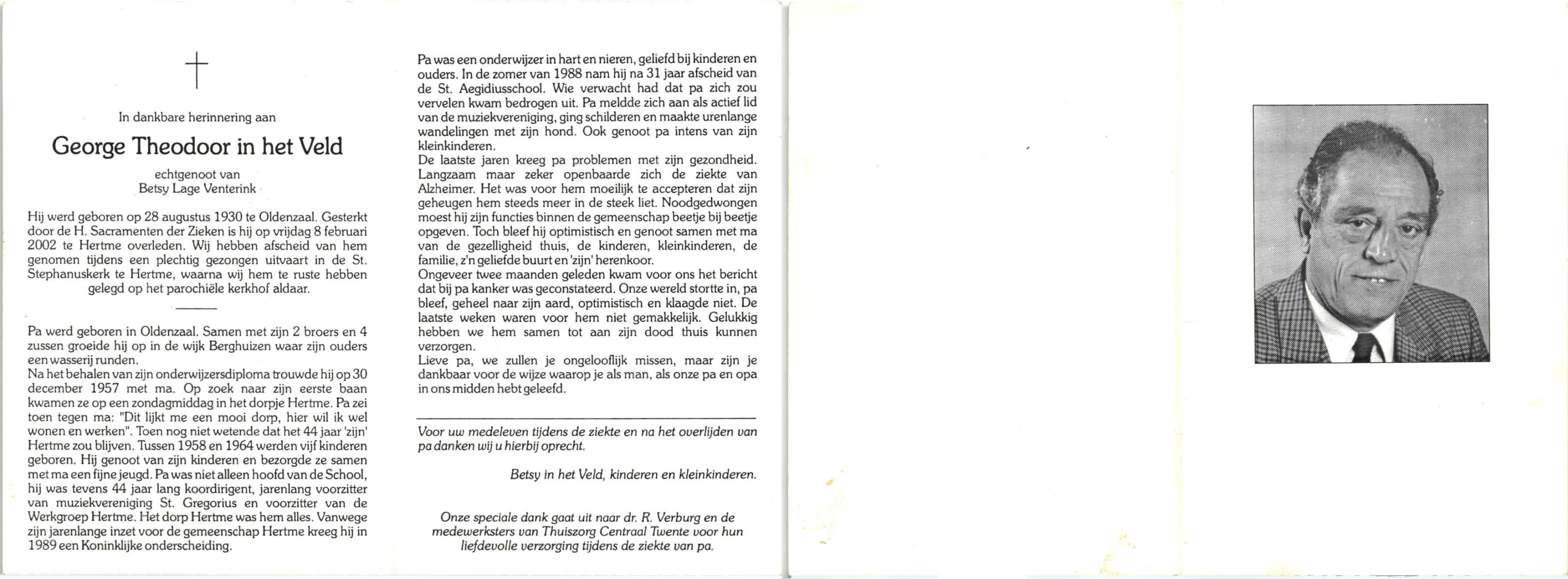 VELD, in het, George Theodoor, geboren op 28-8-1930 te Oldenzaal, overleden op 8-2-2002 te Hertme op 71-jarige leeftijd, begraven te Hertme.
