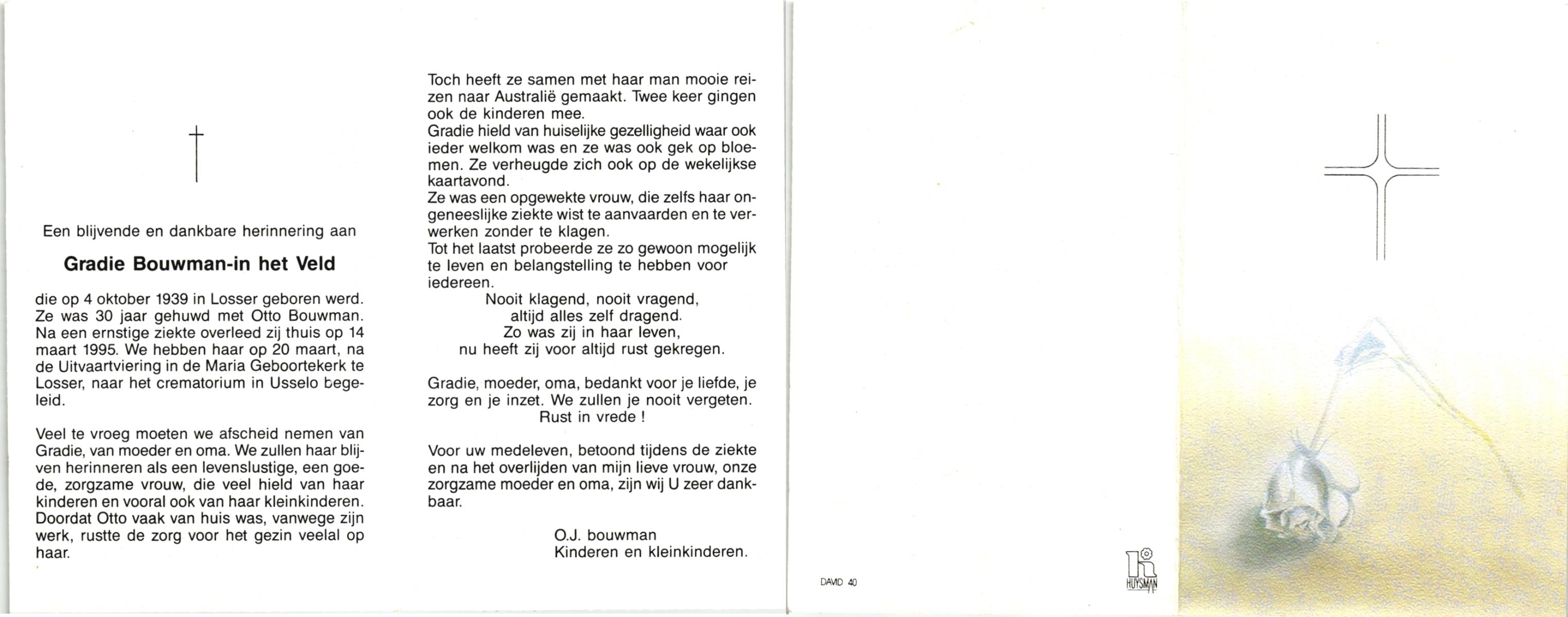 VELD, in het, Gradie, geboren op 4-10-1939 te Losser, overleden op 14-3-1995 te Losser op 55-jarige leeftijd, gecremeerd op 20-3-1995 te Usselo.