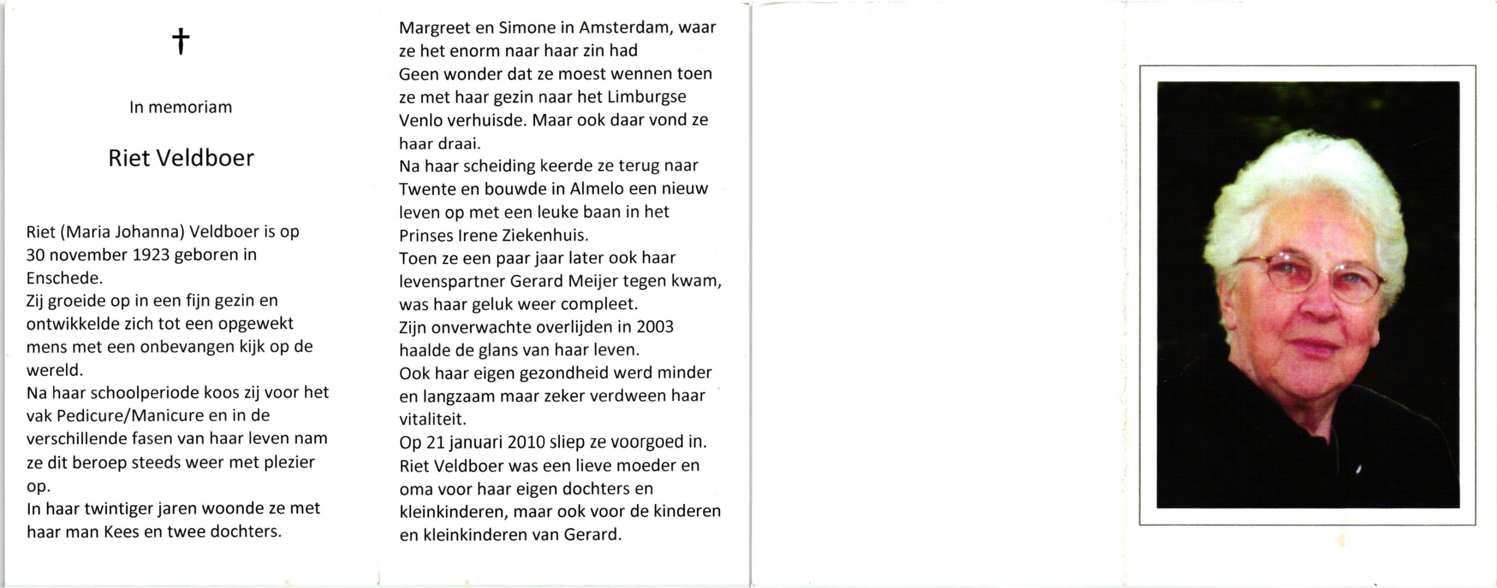 VELDBOER, , Riet, geboren op 30-11-1923 te Enschede, overleden op 21-1-2010 op 86-jarige leeftijd.