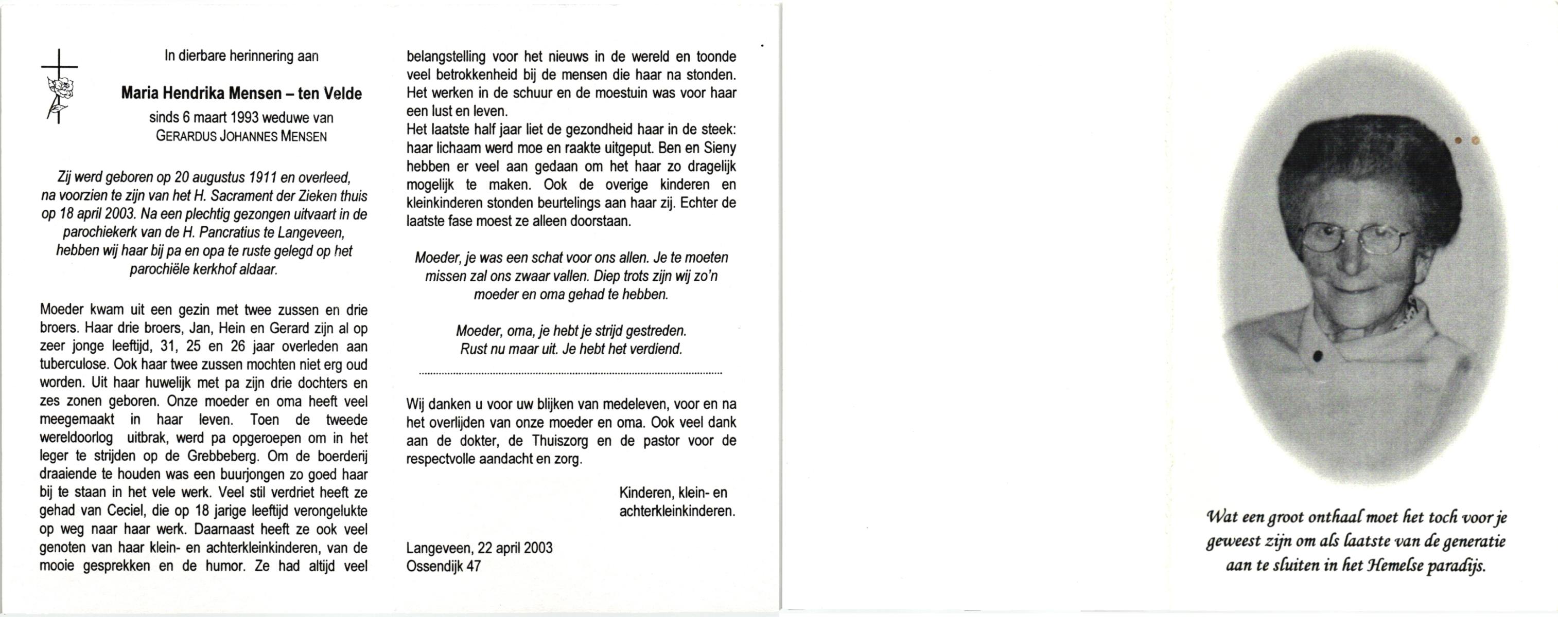 VELDE, ten, Maria Hendrika, geboren op 20-8-1911, overleden op 18-4-2003 op 91-jarige leeftijd, begraven te Langeveen.