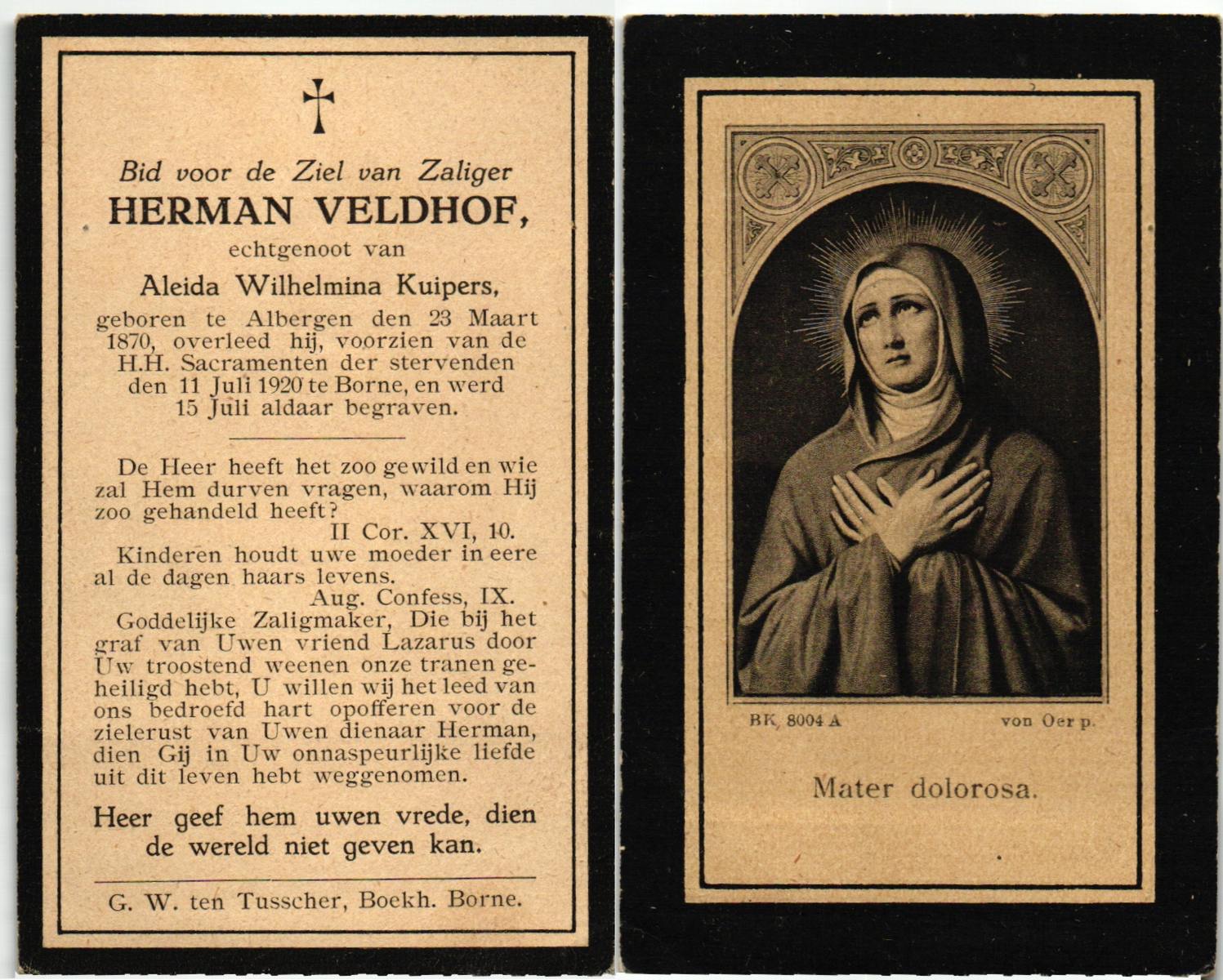 VELDHOF, , Herman, geboren op 23-03-1870 te Albergen, overleden op 11-7-1920 te Borne op 50-jarige leeftijd, begraven op 15-7-1920 te Borne.