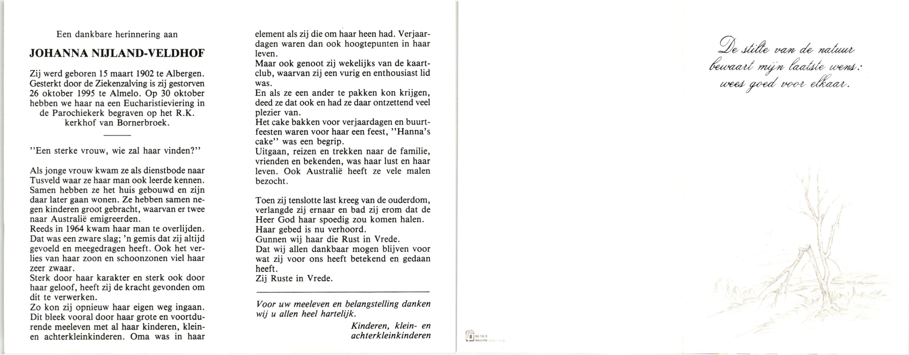VELDHOF, , Johanna, geboren op 15-3-1902 te Albergen, overleden op 26-10-1995 te Almelo op 93-jarige leeftijd, begraven op 30-10-1995 te Bornerbroek.