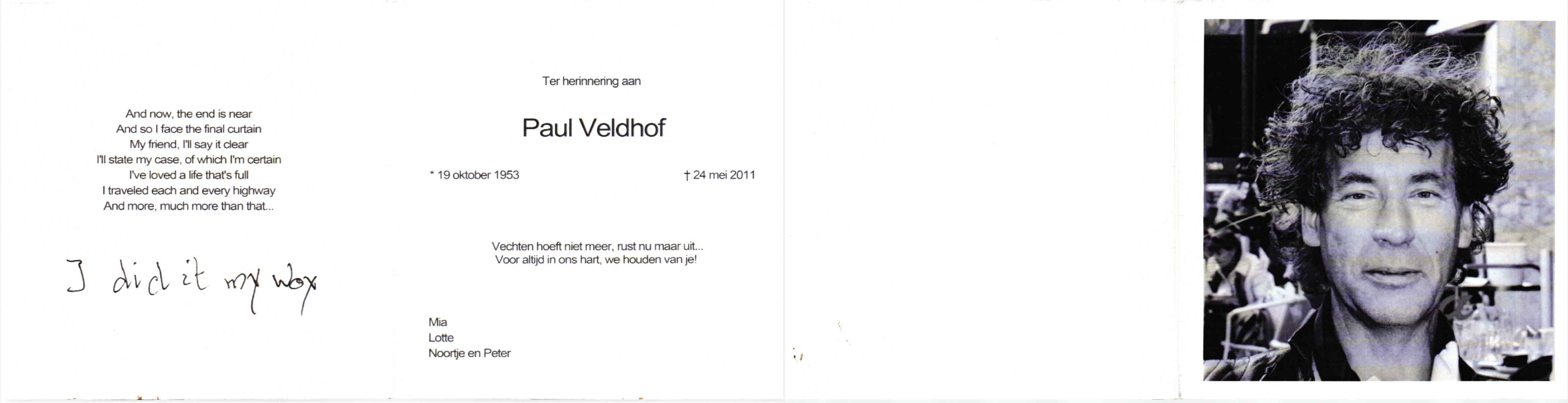 VELDHOF, , Paul, geboren op 19-10-1953, overleden op 24-5-2011 op 57-jarige leeftijd.