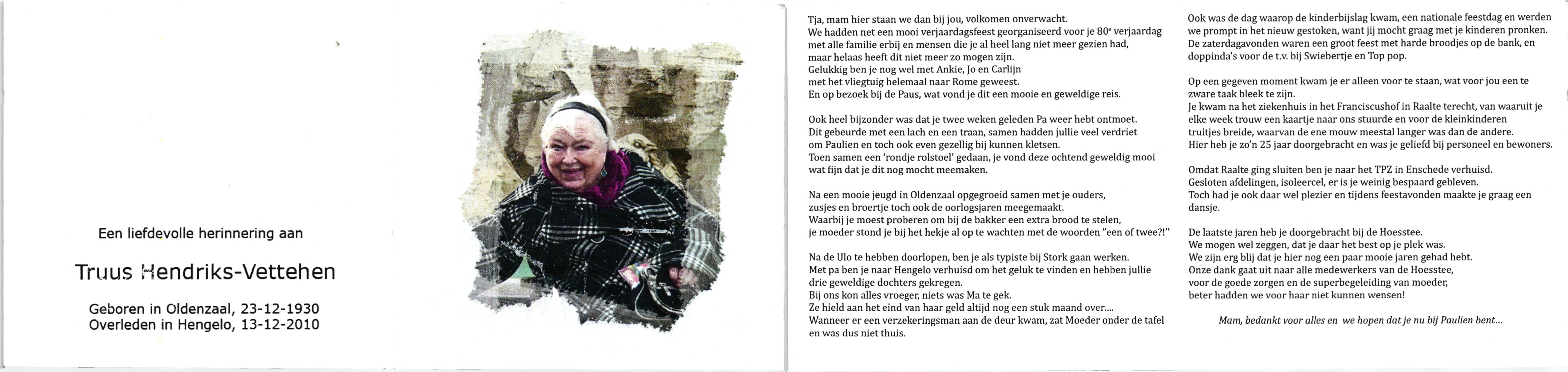 VETTEHEN, , Truus, geboren op 23-12-1930 te Oldenzaal, overleden op 13-12-2010 te Hengelo (O) op 79-jarige leeftijd.