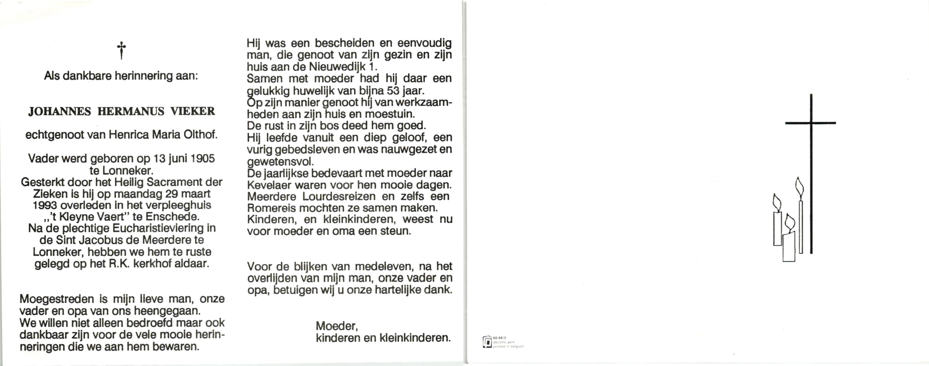 VIEKER, , Johannes Hermanus, geboren op 13-6-1905 te Lonneker, overleden op 29-3-1993 te Enschede op 86-jarige leeftijd, begraven te Lonneker.