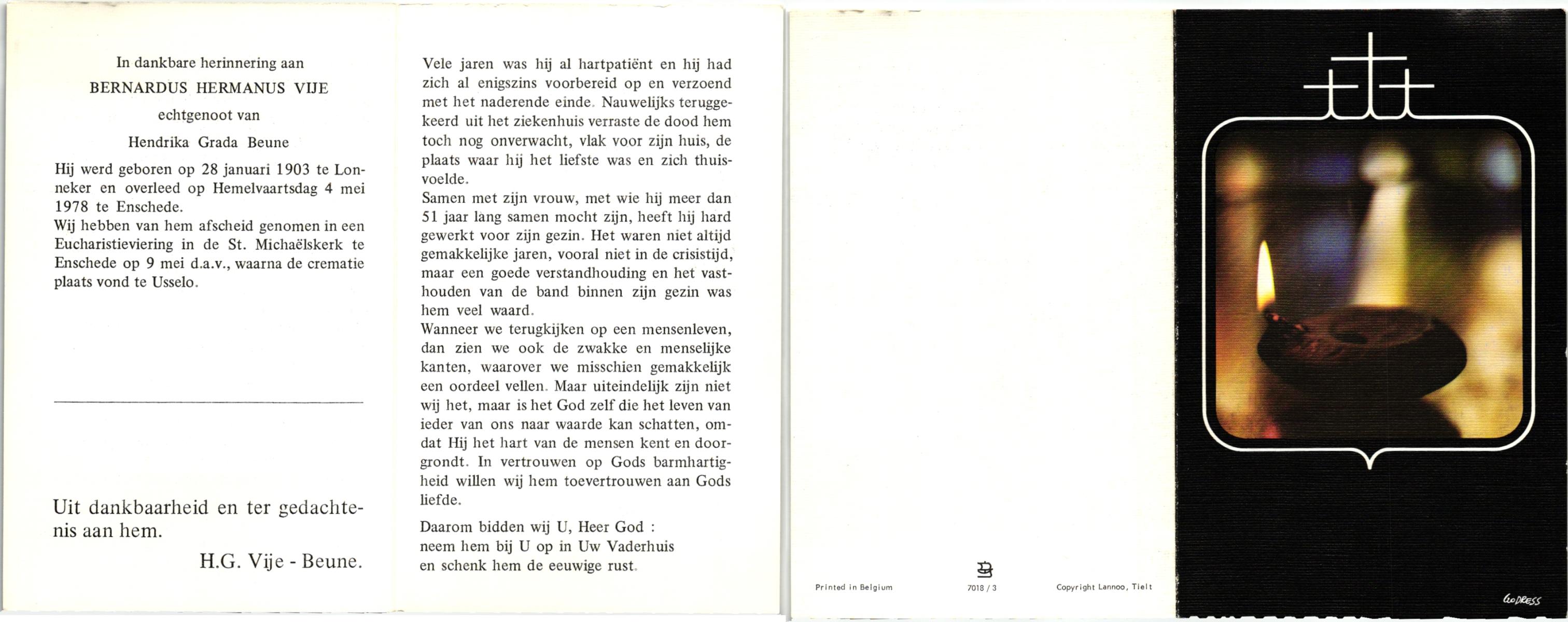 VIJE, , Bernardus Hermanus, geboren op 28-1-1903 te Lonneker, overleden op 4-5-1978 te Enschede op 75-jarige leeftijd, gecremeerd op 9-5-1978 te Usselo.
