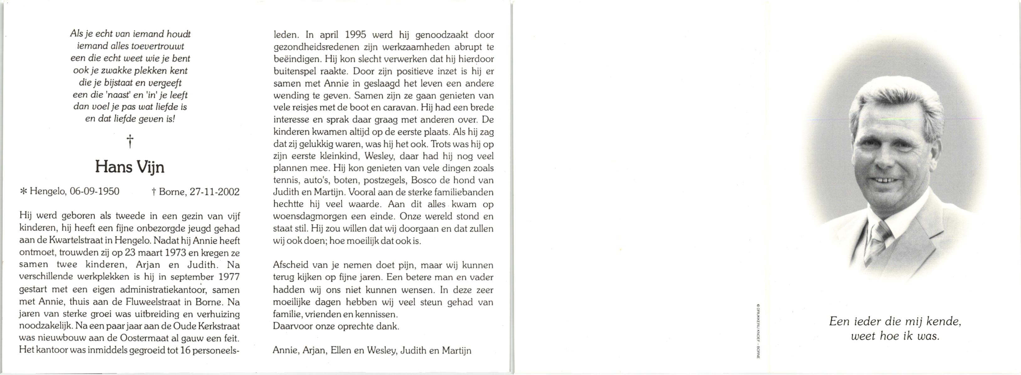 VIJN, , Hans, geboren op 6-9-1950 te Hengelo (O), overleden op 27-11-2002 te Borne op 52-jarige leeftijd.