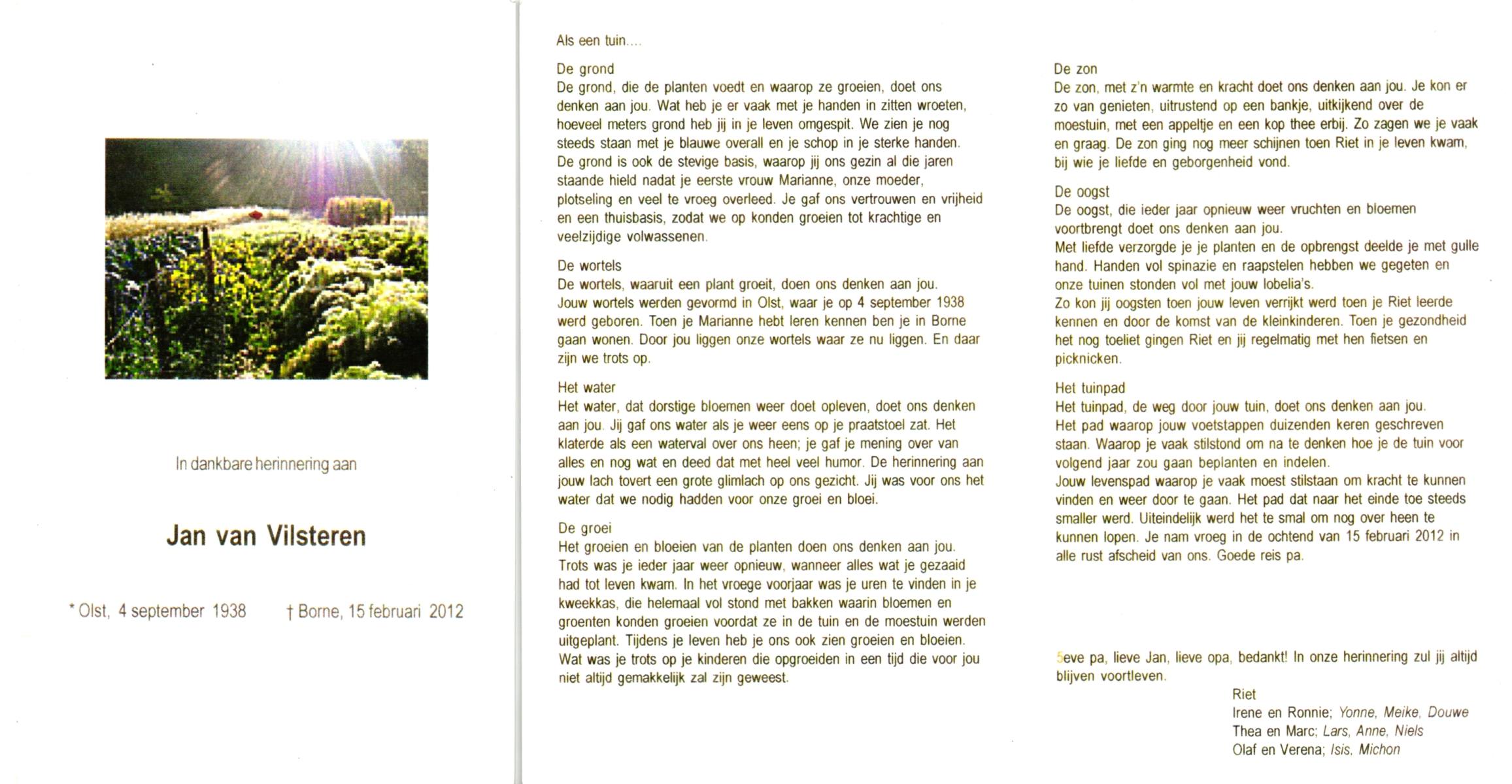 VILSTEREN, van, Jan, geboren op 4-9-1938 te Olst, overleden op 15-2-2012 te Borne op 73-jarige leeftijd.