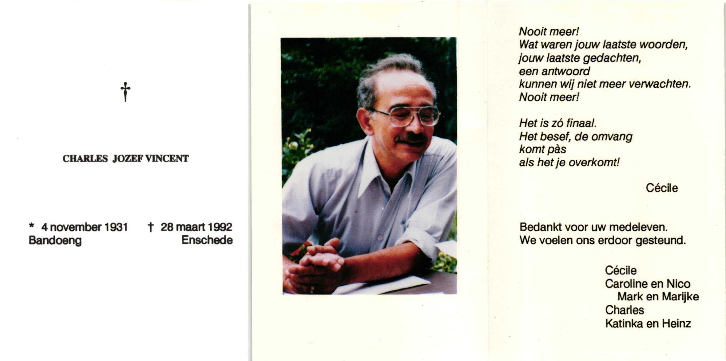 VINCENT, , Charles Jozef, geboren op 4-11-1931 te Bandoeng, Ind., overleden op 28-3-1992 te Enschede op 60-jarige leeftijd.