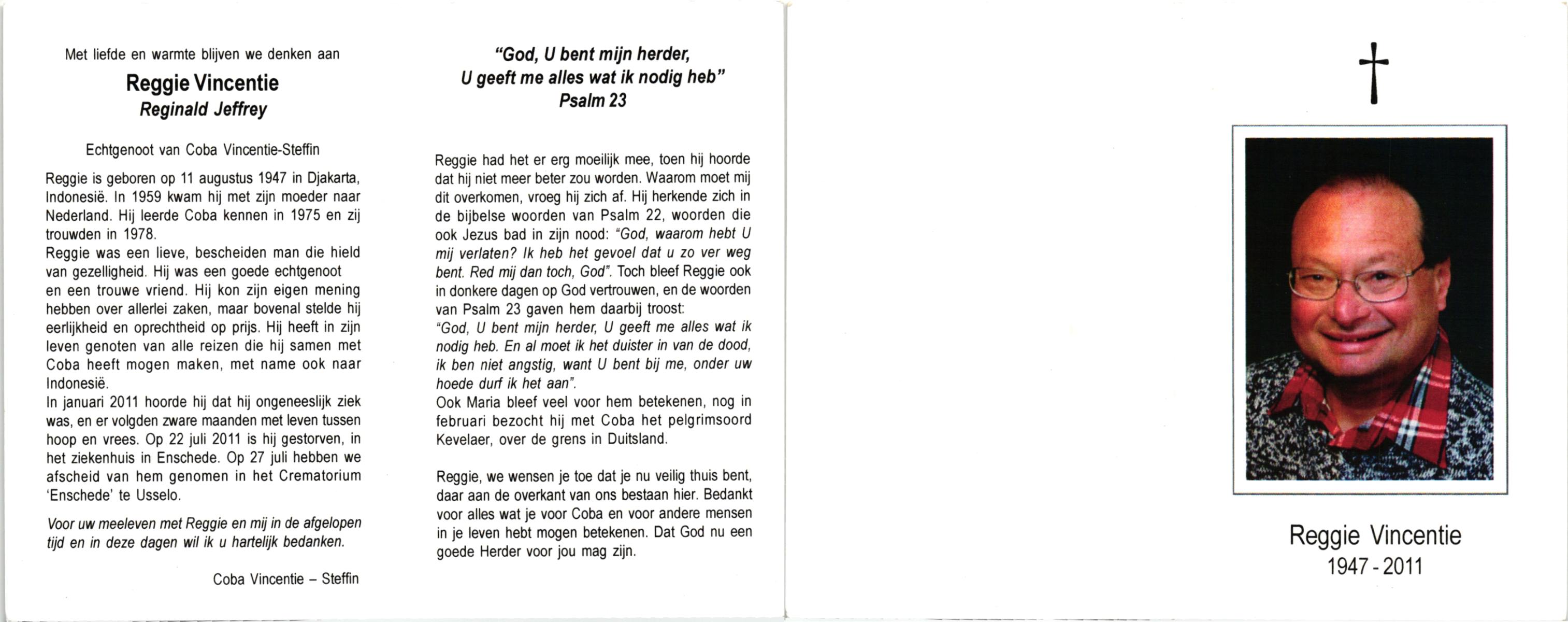 VINCENTIE, , Reginald Jeffrey (Reggue), geboren op 11-8-1947 te Djakarta, Ind., overleden op 22-7-2011 te Enschede op 63-jarige leeftijd, gecremeerd op 27-7-2011 te Usselo.