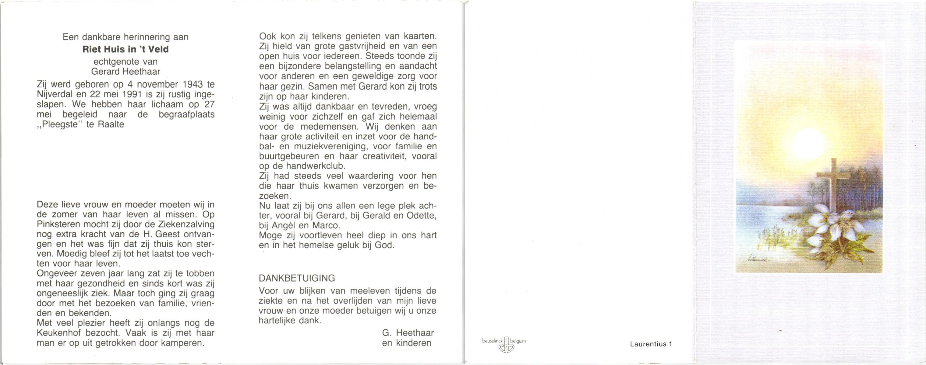 VELD, in 't, Riet, geboren op 4-11-1943 te Hellendoorn, Nijverdal, overleden op 22-5-1991 op 47-jarige leeftijd, begraven op 27-5-1991 te Raalte.