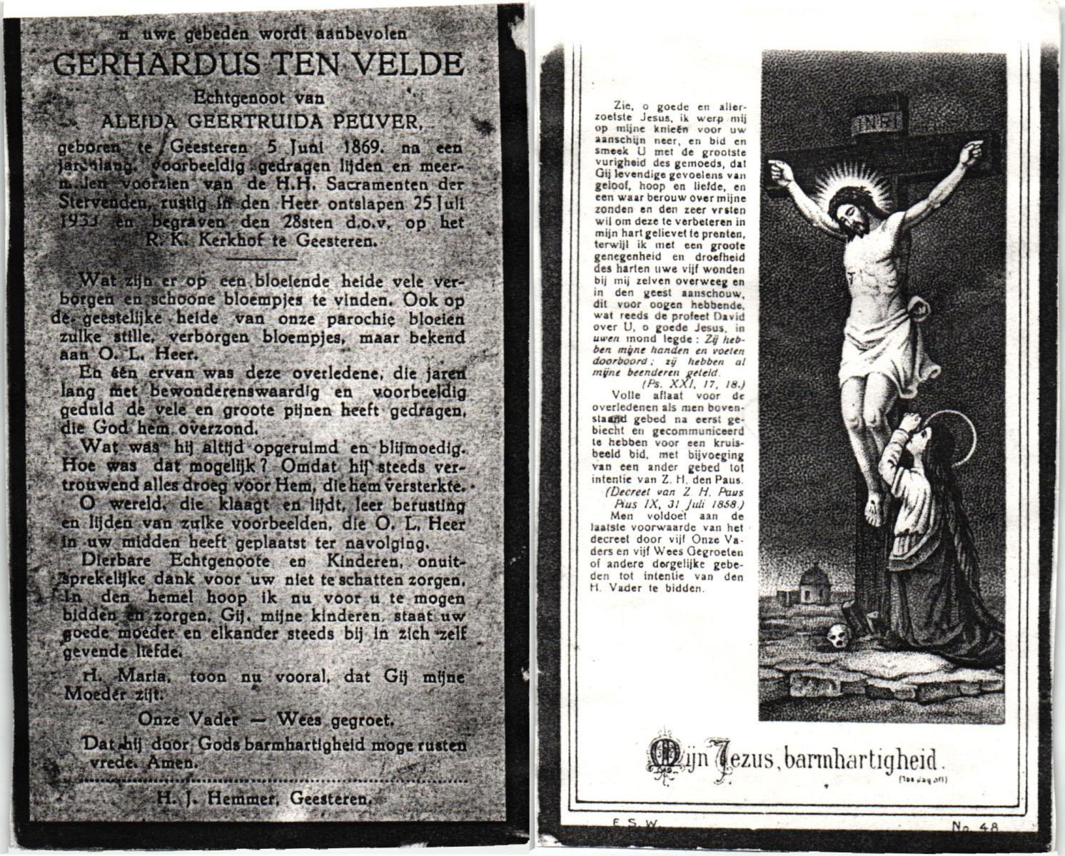 VELDE, ten, Gerhardus, geboren op 05-06-1869 te Geesteren, overleden op 25-7-1933 te Geesteren op 64-jarige leeftijd, begraven op 28-7-1933 te Geesteren.