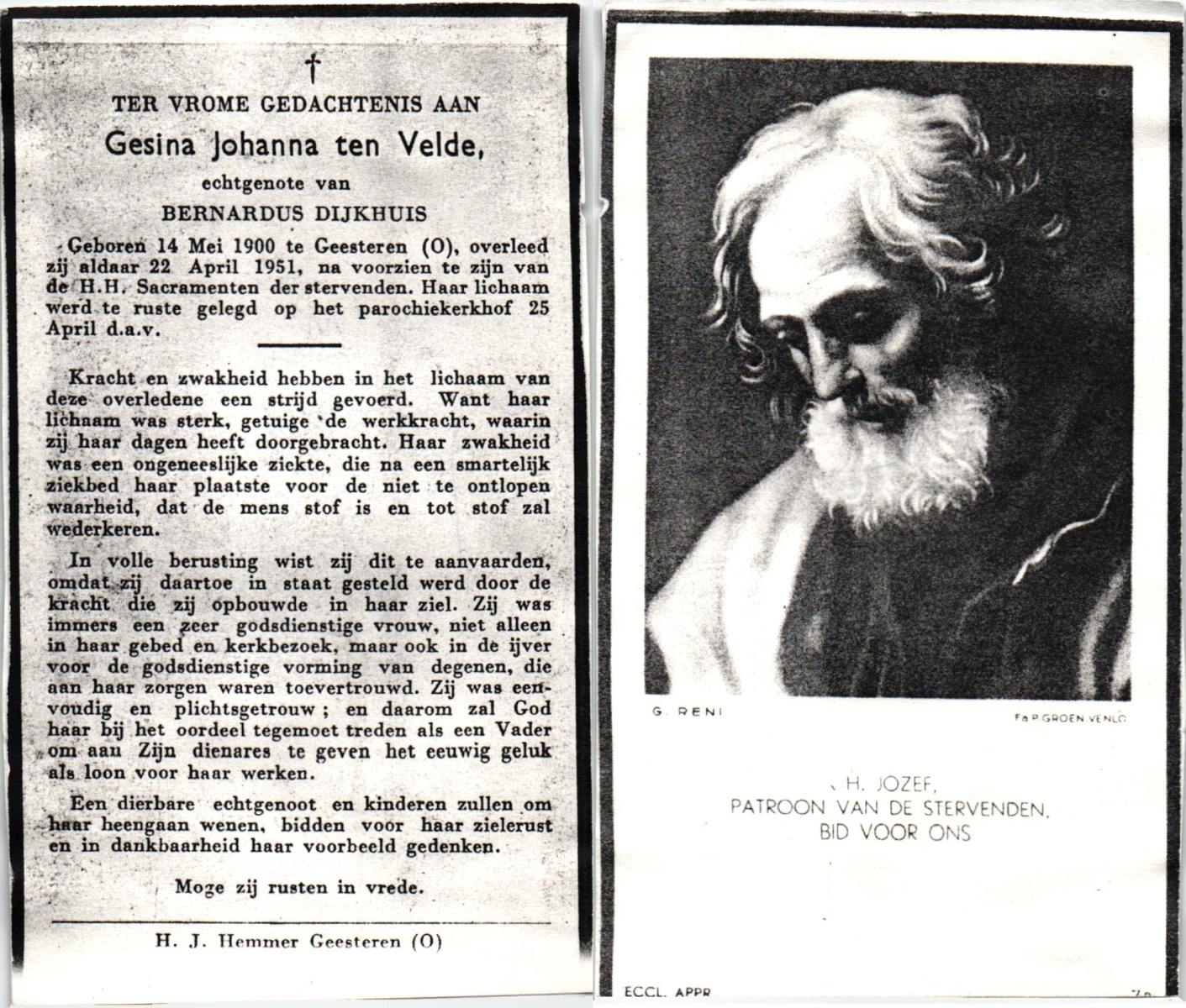 VELDE, ten, Gesina Johanna, geboren op 14-5-1900 te Geesteren, overleden op 22-4-1951 te Geesteren op 50-jarige leeftijd, begraven op 25-4-1951 te Geesteren.