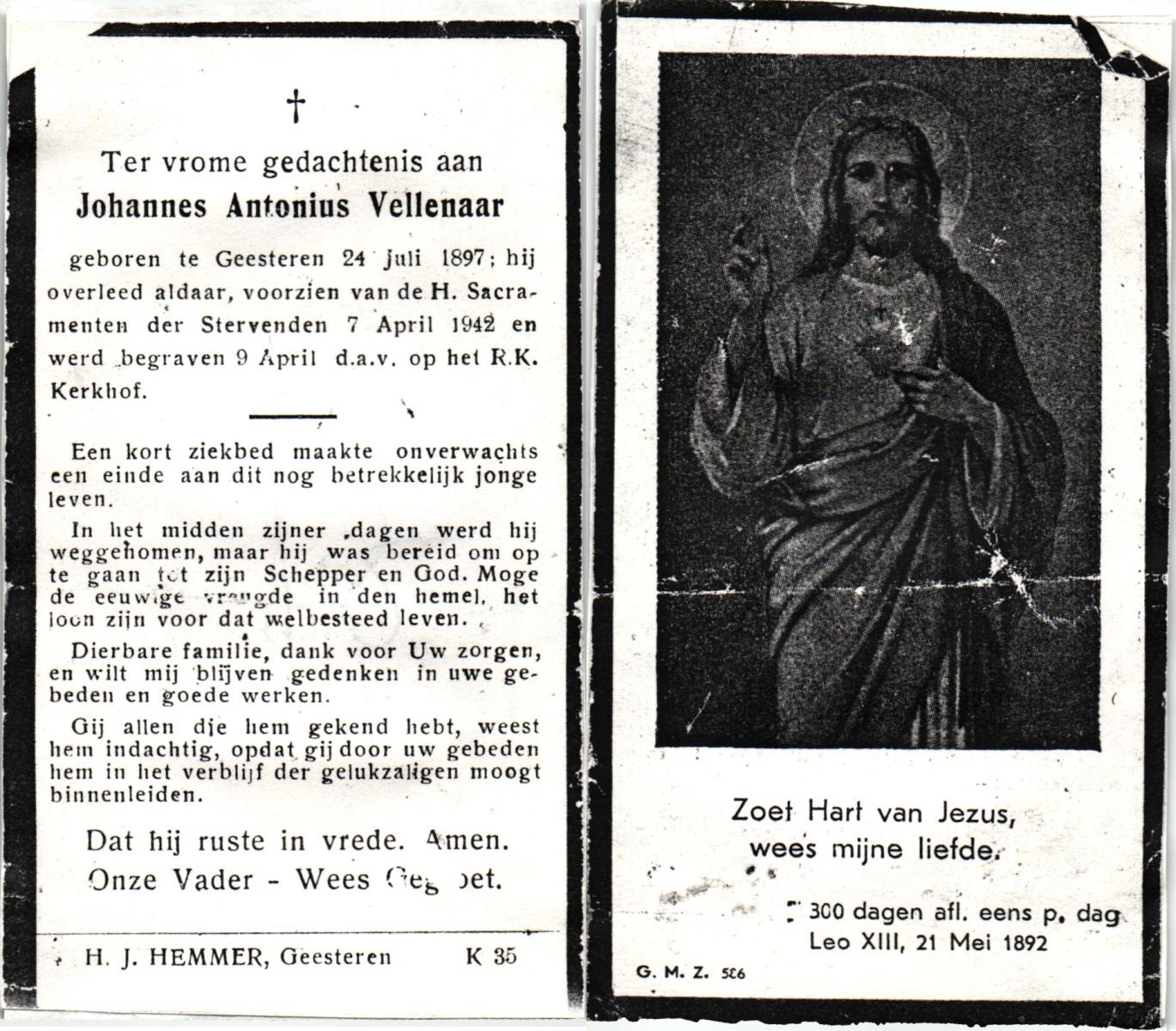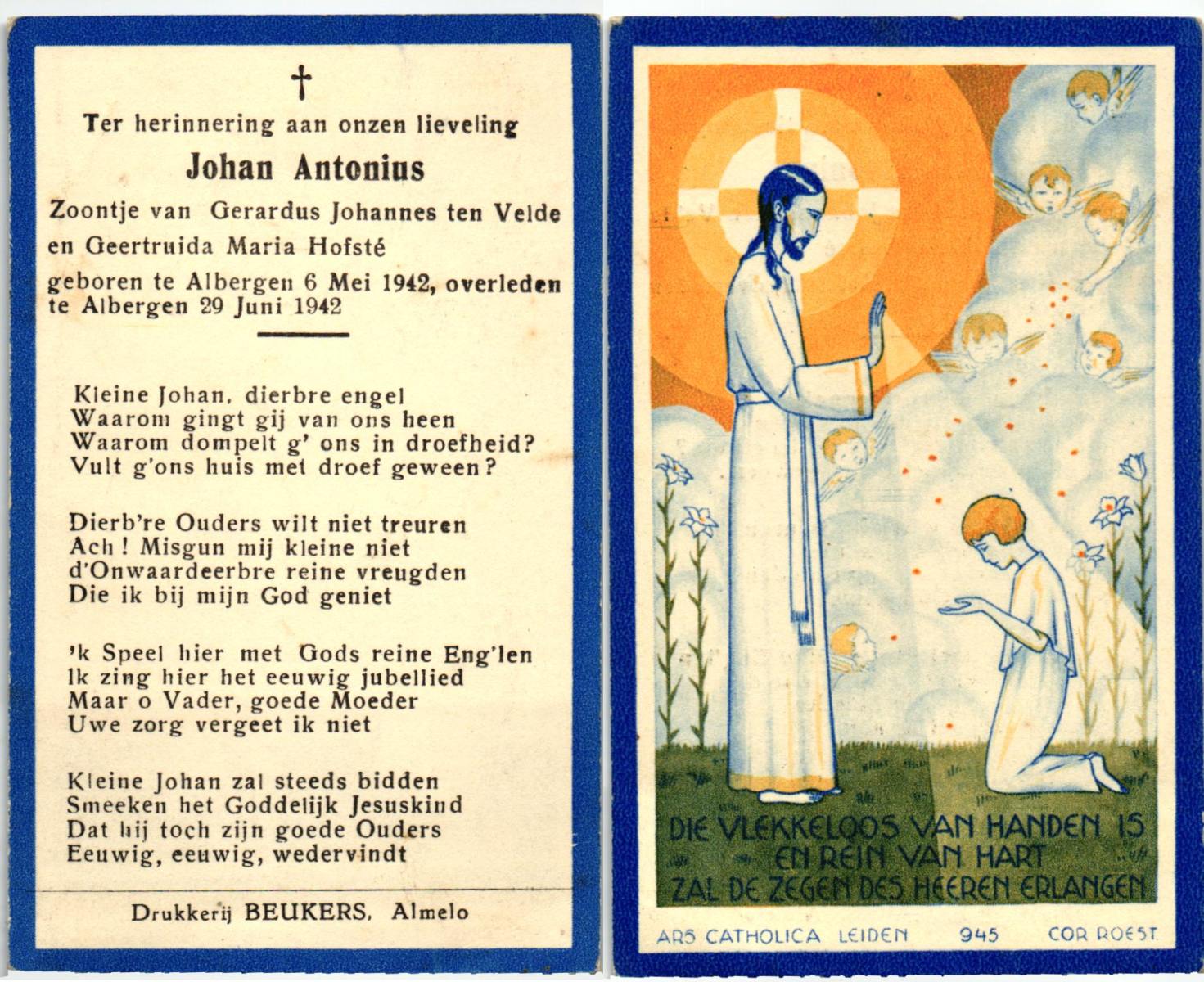 VELDE, ten, Johan Antonius, geboren op 6-5-1942 te Albergen, overleden op 29-6-1942 te Albergen op 0-jarige leeftijd.