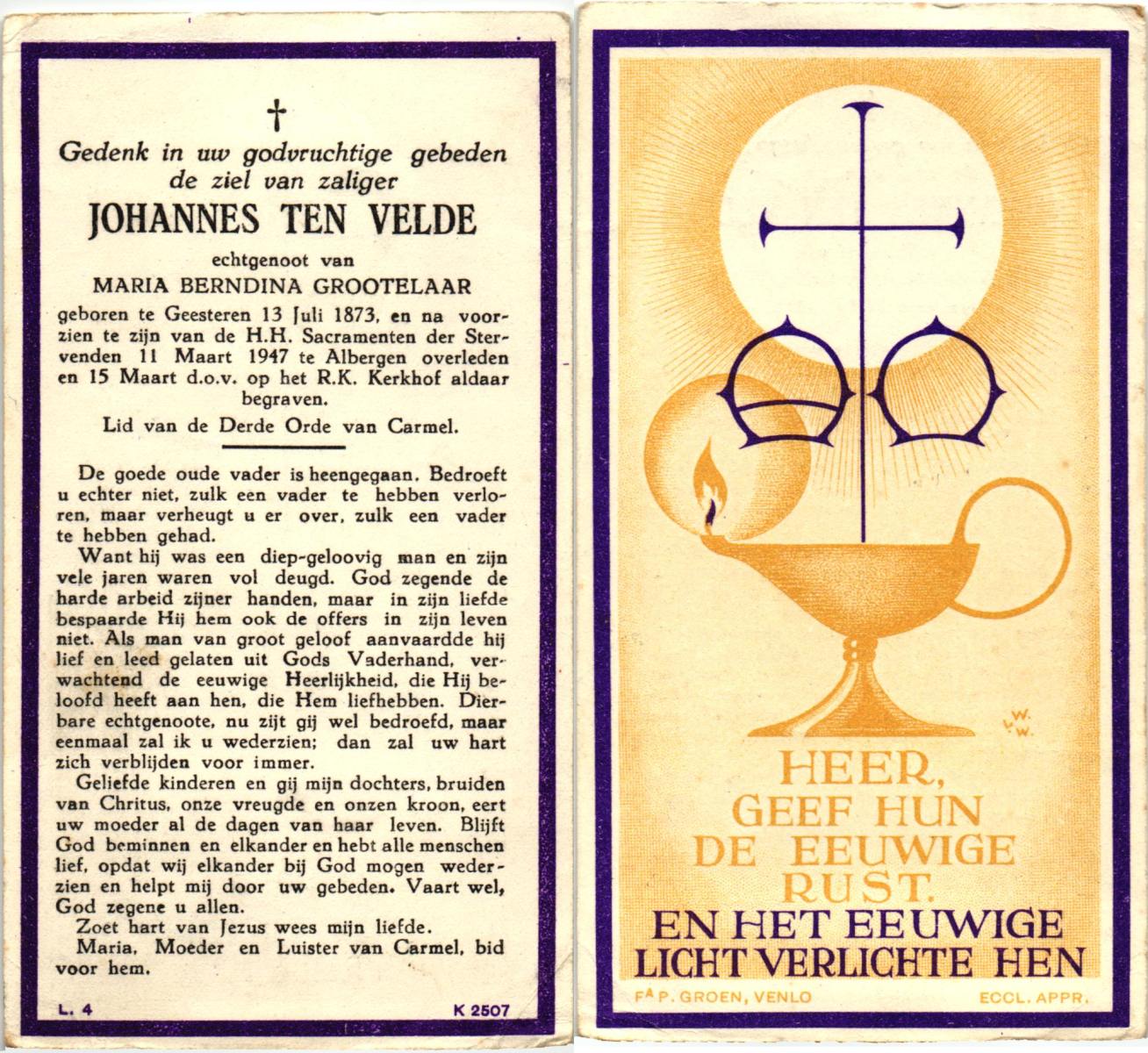 VELDE, ten, Johannes, geboren op 13-07-1873 te Geesteren, overleden op 11-3-1947 te Albergen op 73-jarige leeftijd, begraven op 15-3-1947 te Albergen.