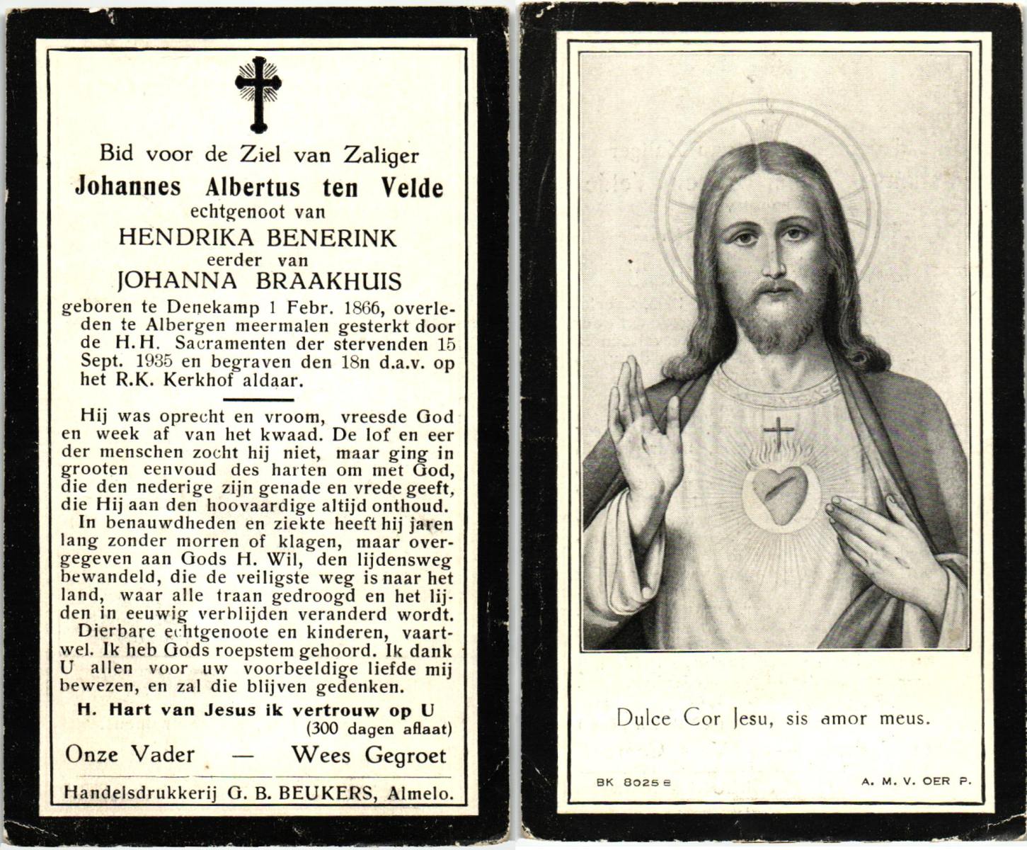 VELDE, ten, Johannes Albertus, geboren op 01-02-1866 te Denekamp, overleden op 15-9-1935 te Albergen op 69-jarige leeftijd, begraven op 18-9-1935 te Albergen.