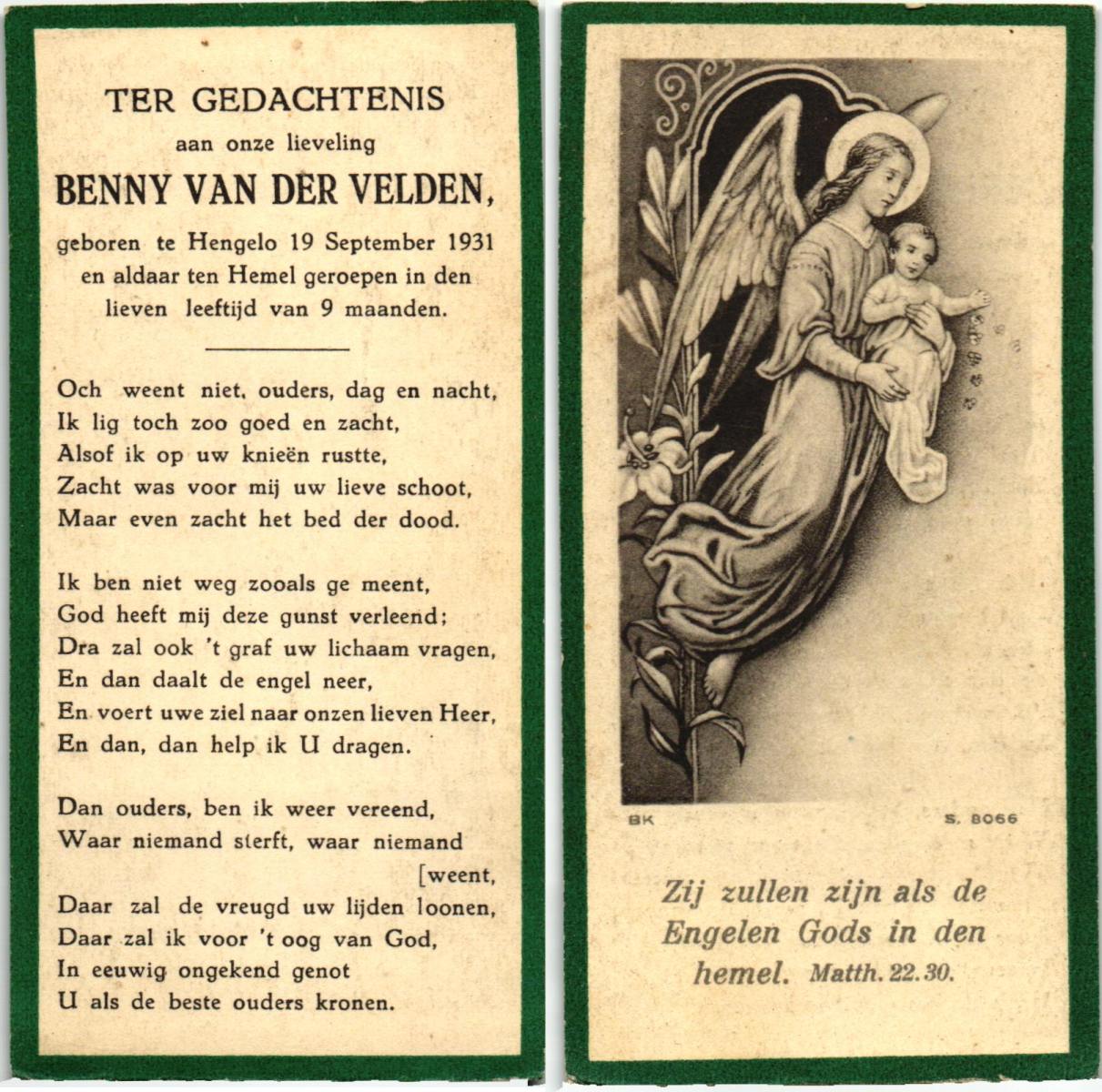 VELDEN, van der, Benny, geboren op 19-9-1931 te Hengelo, overleden op 00-00-1932 te Hengelo op 0-jarige leeftijd.