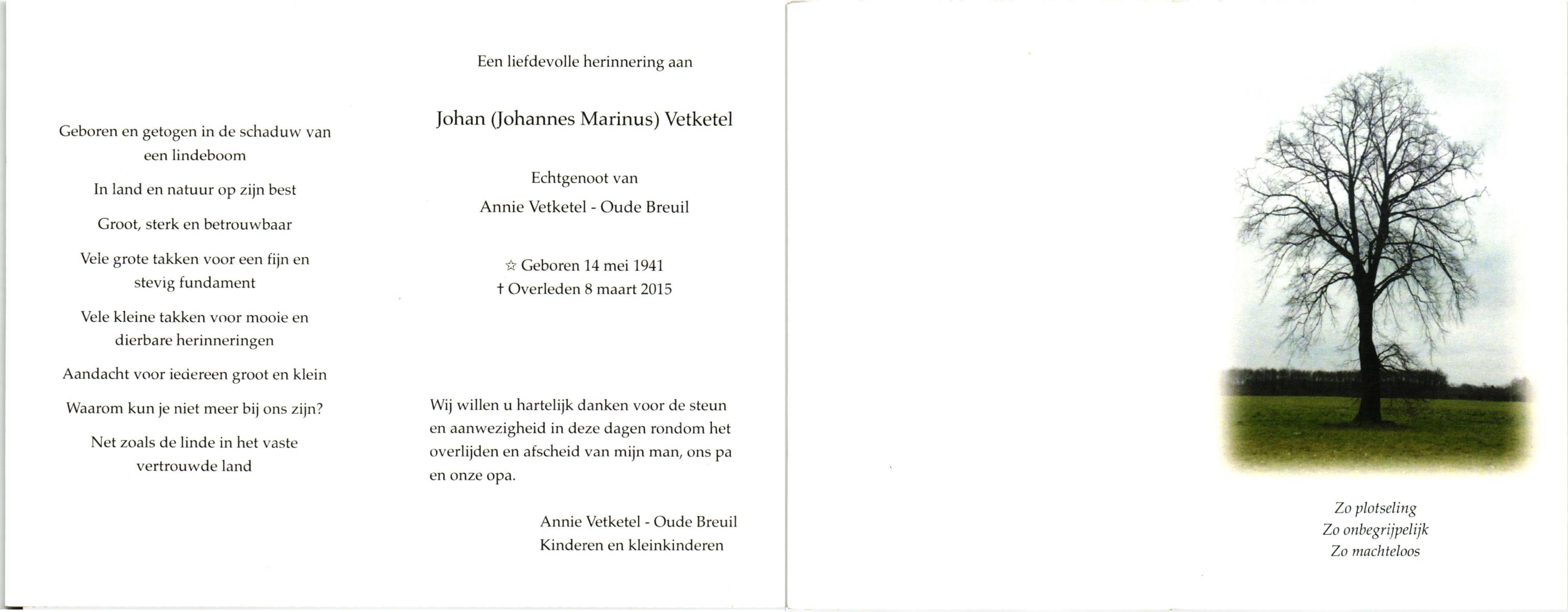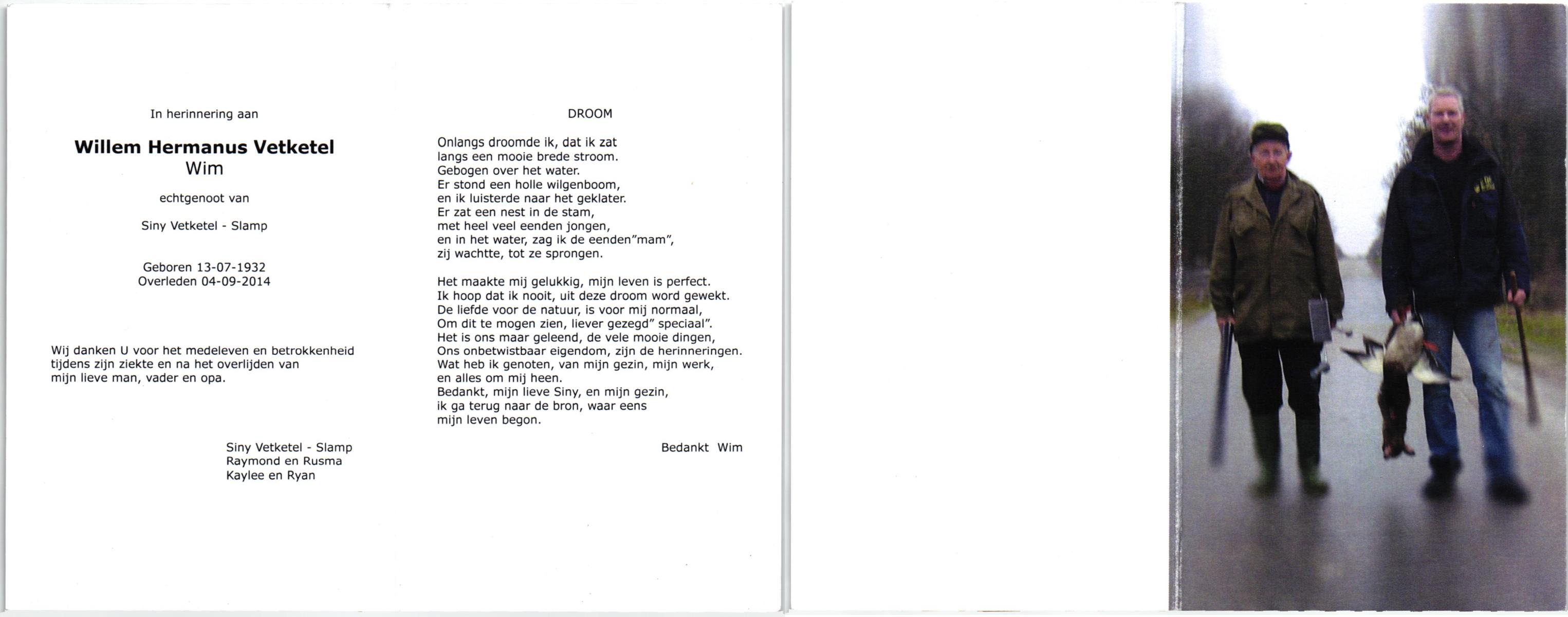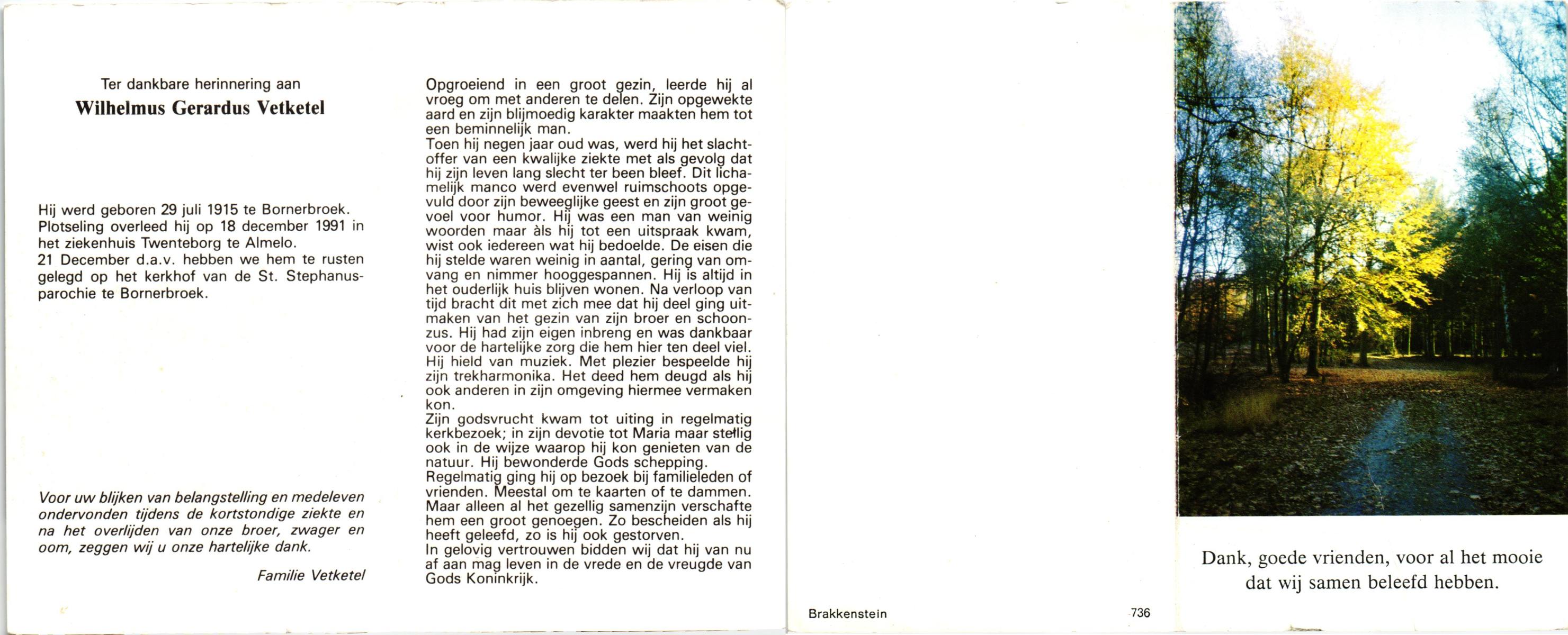 VETKETEL, Wilhelmus Gerardus, geboren op 29-7-1915 te Bornerbroek, overleden op 18-12-1991 te Almelo, ziekenhuis op 76-jarige leeftijd, begraven op 21-12-1991 te Bornerbroek.