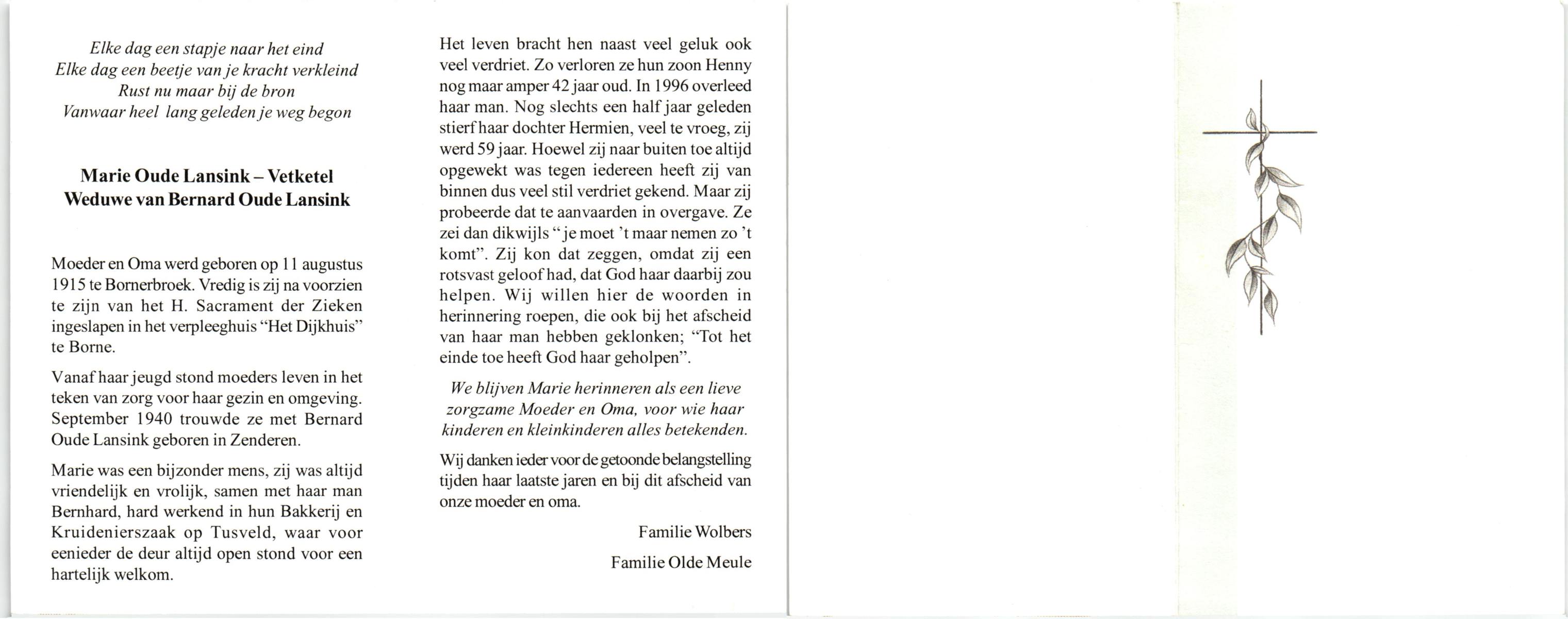 VETKETEL, Marie, geboren op 11-8-1915 te Bornerbroek, overleden op 00-00-0001 te Borne.
