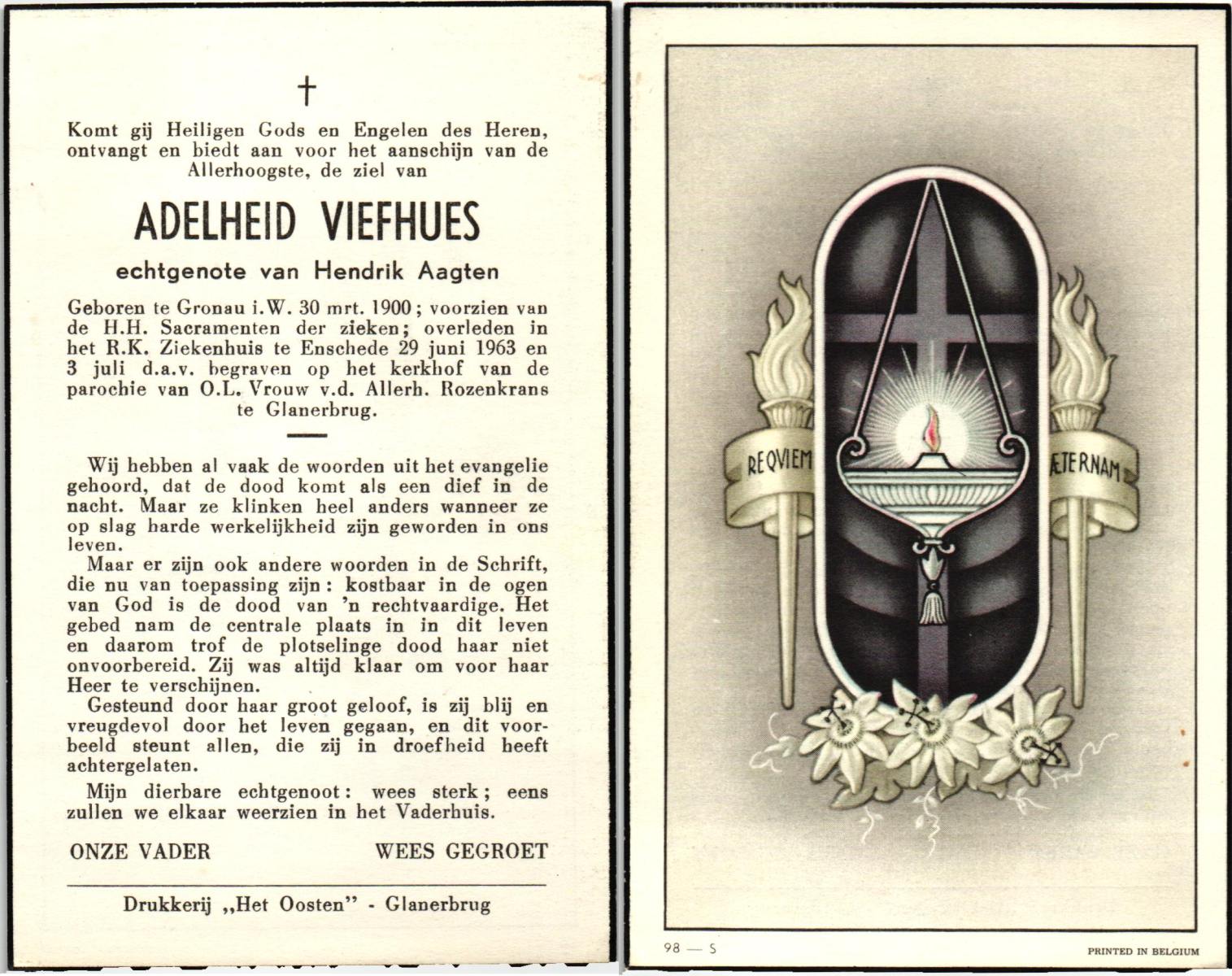 VIEFHUES, Adelheid, geboren op 30-3-1900 te Gronau, Dld, overleden op 29-6-1963 te Enschede, ziekenhuis op 63-jarige leeftijd, begraven op 3-7-1963 te Glanerbrug.