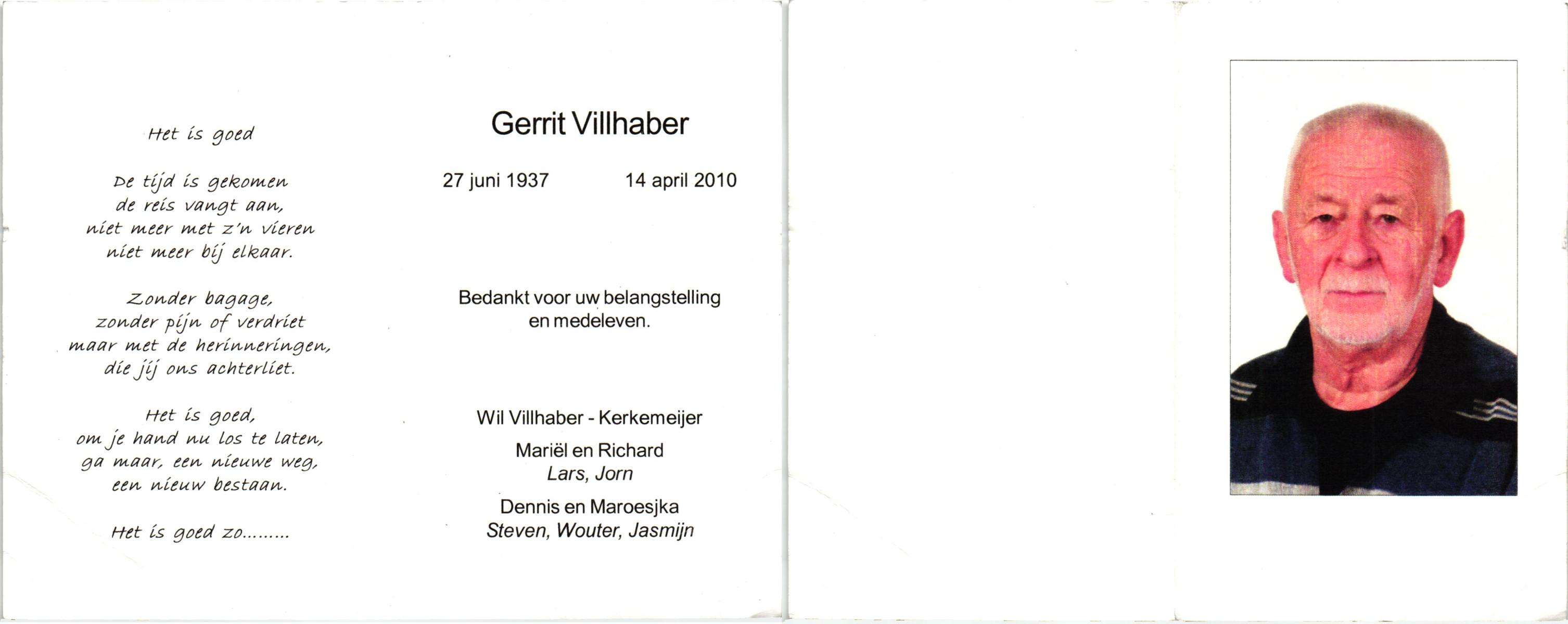 VILLHABER, Gerrit, geboren op 27-6-1937, overleden op 14-4-2010 op 72-jarige leeftijd.