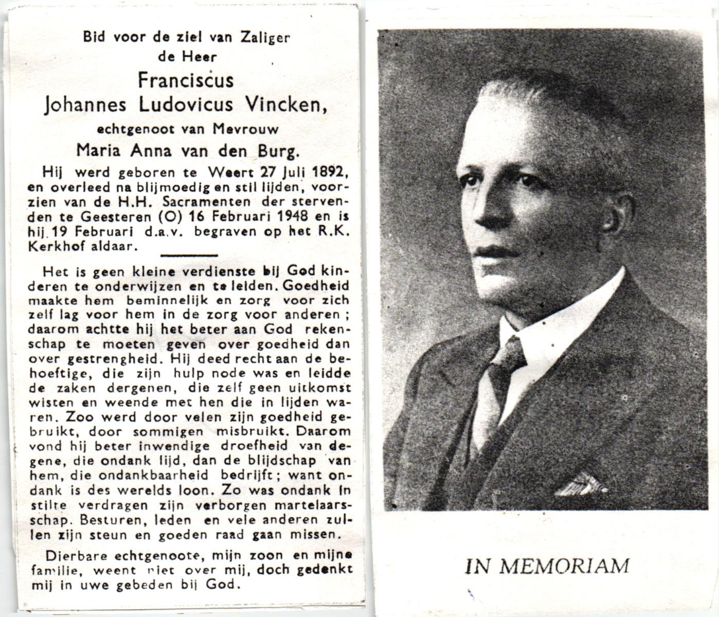 VINCKEN, Franciscus Johannes Ludovicus, geboren op 27-07-1892 te Weert, overleden op 16-2-1948 te Geesteren op 55-jarige leeftijd, begraven op 19-2-1948 te Geesteren.