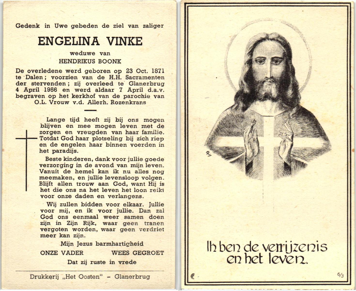 VINKE, Engelina, geboren op 23-10-1871 te Dalen, overleden op 4-4-1956 te Glanerbrug op 84-jarige leeftijd, begraven op 7-4-1956 te Glanerbrug.