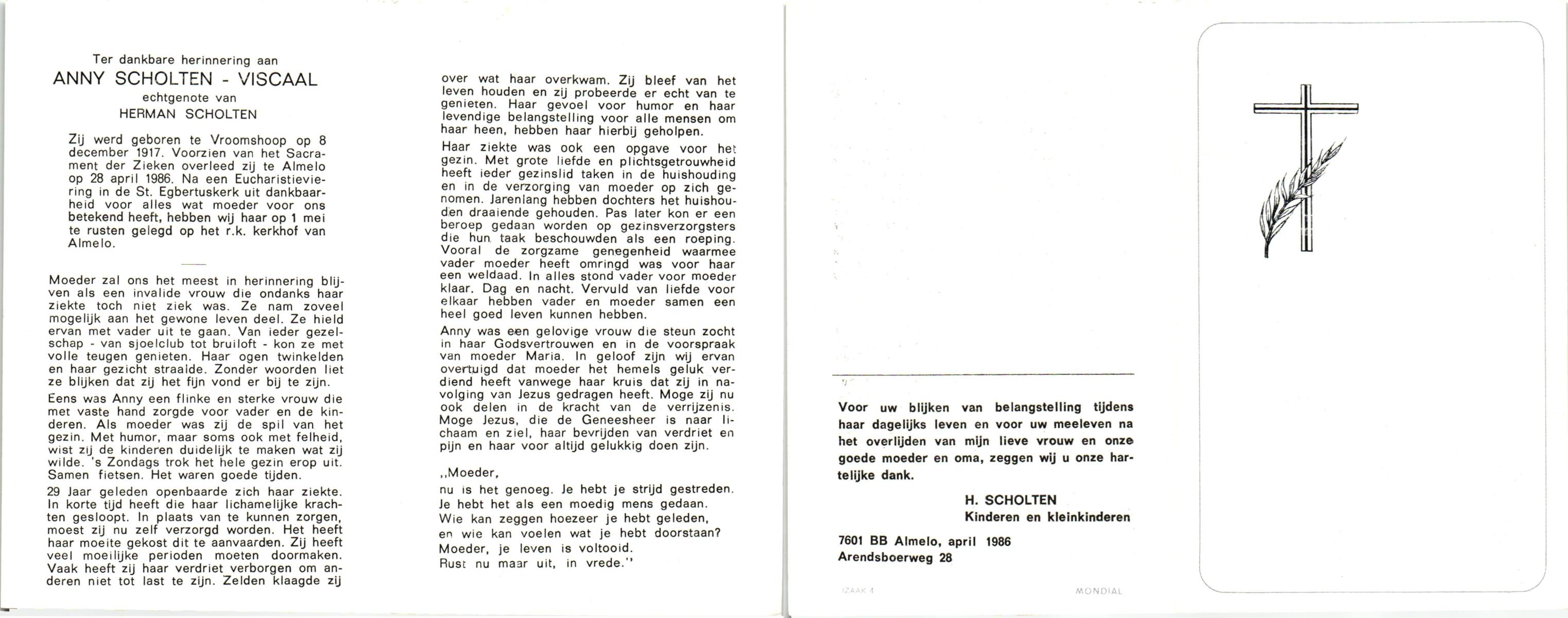 VISCAAL, Anny, geboren op 6-12-1917 te Vroomshoop, overleden op 28-4-1986 te Almelo op 68-jarige leeftijd, begraven op 1-5-1986 te Almelo.