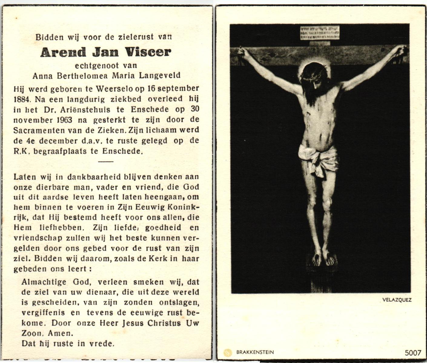 VISCER, Arend Jan, geboren op 16-09-1884 te Weerselo, overleden op 30-11-1963 te Enschede op 79-jarige leeftijd, begraven op 4-12-1963 te Enschede.