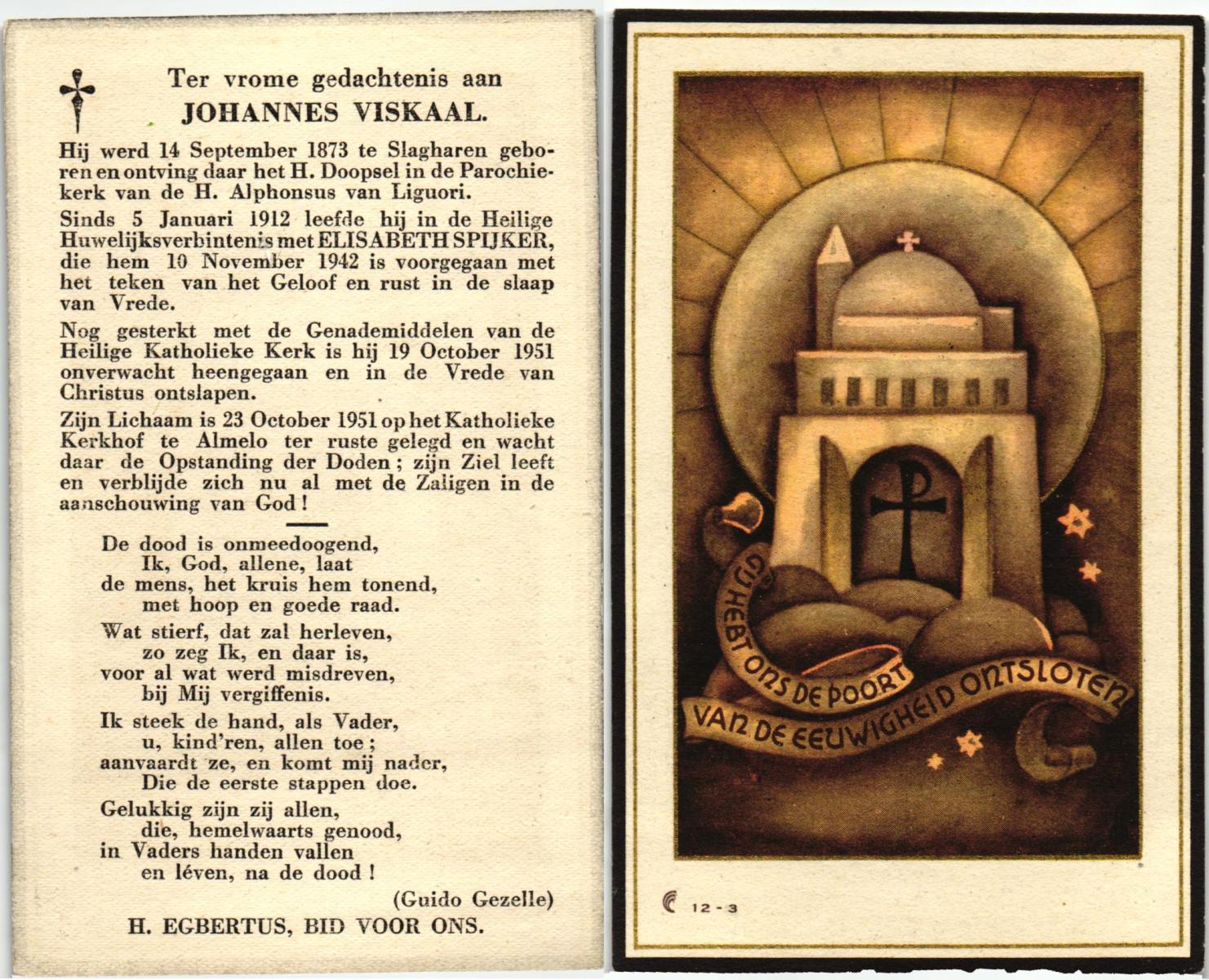 VISKAAL, Johannes, geboren op 14-09-1873 te Slagharen, overleden op 19-10-1951 op 78-jarige leeftijd, begraven op 23-10-1951 te Almelo.