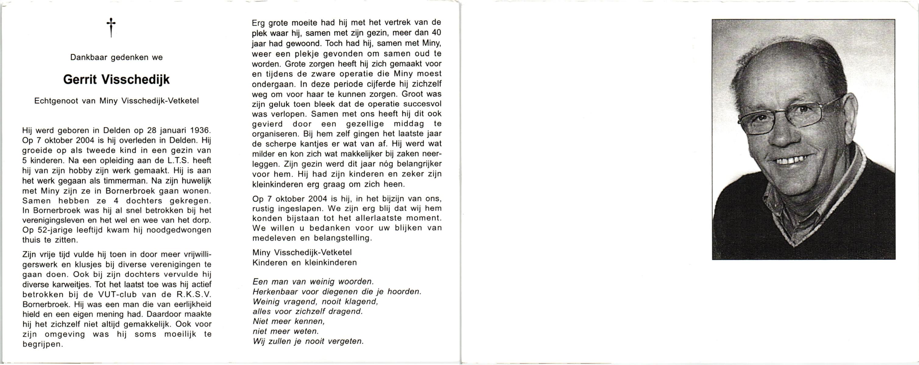 VISSCHEDIJK, Gerrit, geboren op 28-1-1936 te Delden, overleden op 7-10-2004 te Delden op 68-jarige leeftijd.