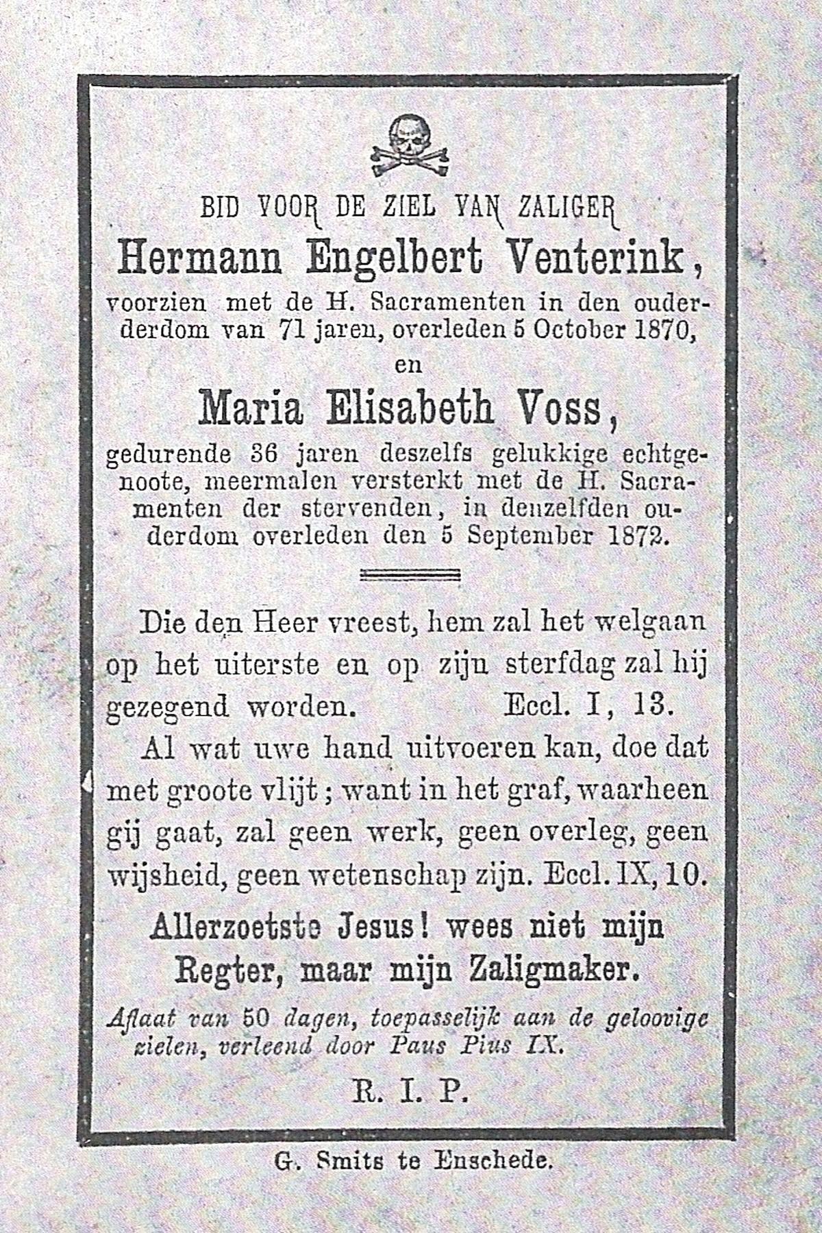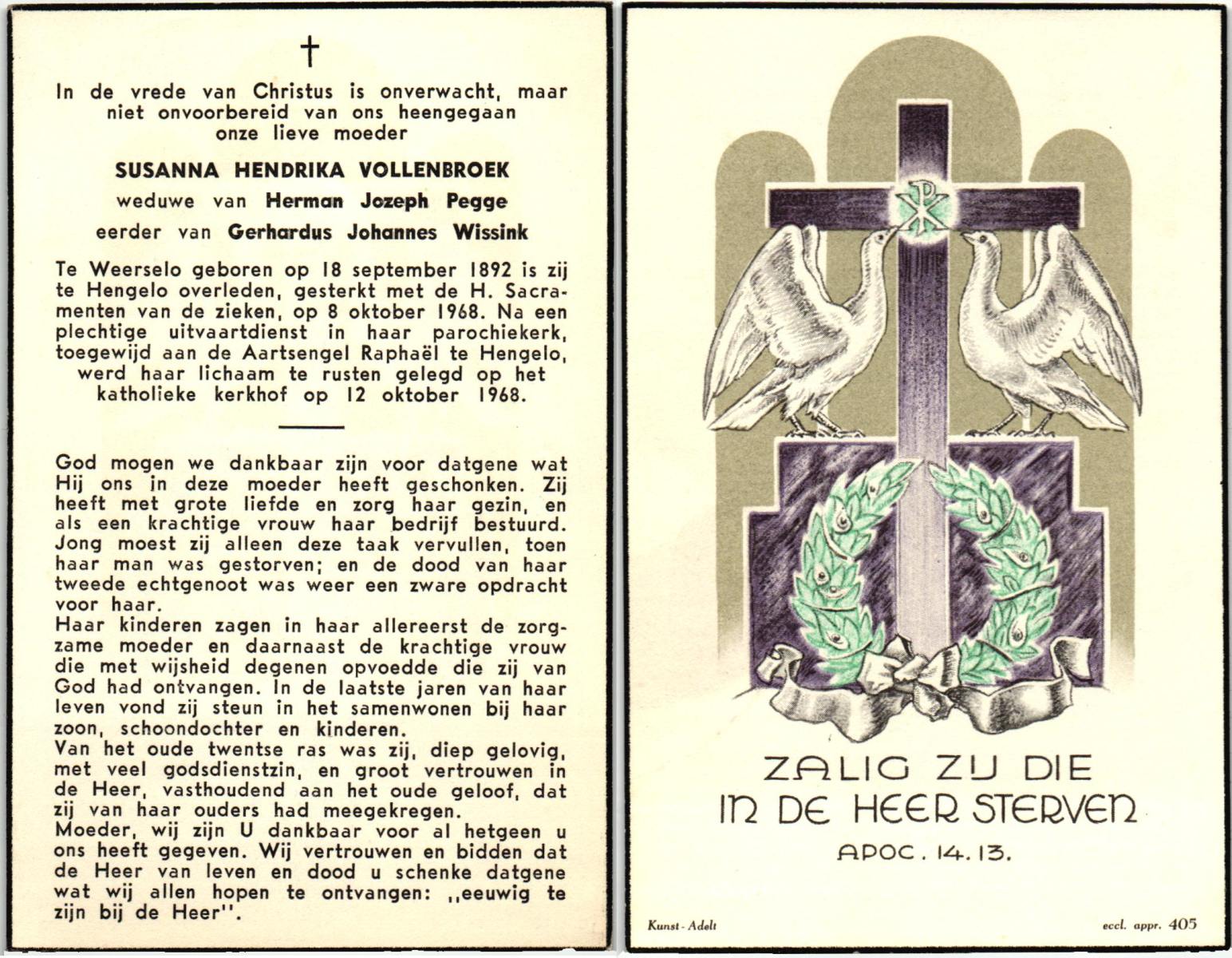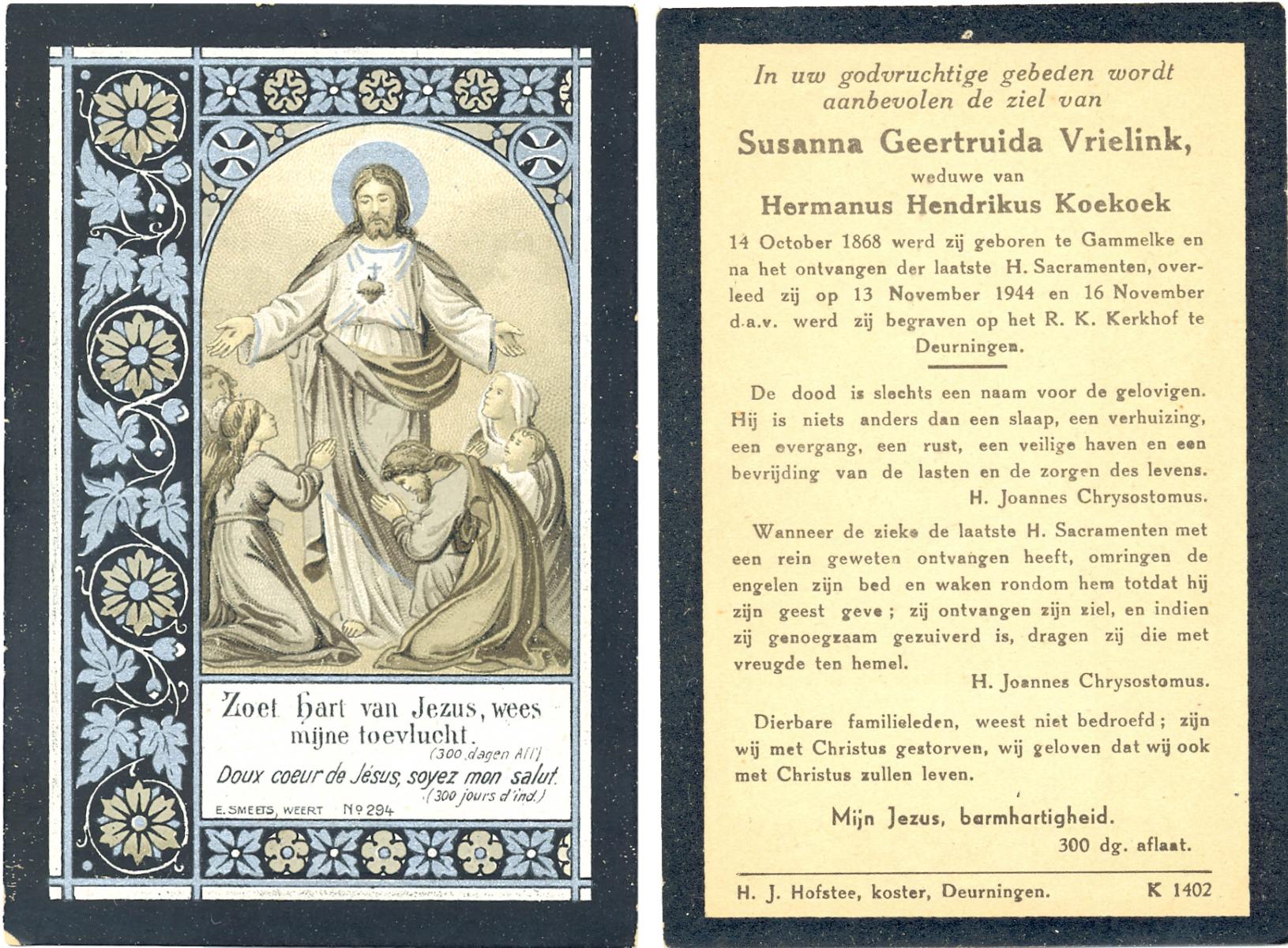 VRIELINK, Susanna Geertruida, geboren op 14-10-1868 te Gammelke, overleden op 13-11-1944 op 76-jarige leeftijd, begraven op 16-11-1944 te Deurningen.