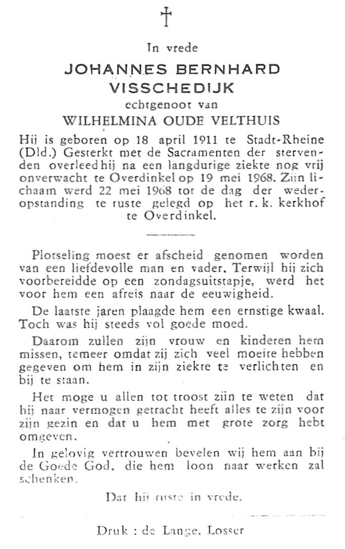 VISSCHEDIJK, Johannes Bernard, geboren op 18-4-1911 te Rheine, Stadt(D), overleden op 19-5-1968 te Overdinkel op 57-jarige leeftijd, begraven op 22-5-1968 te Overdinkel.