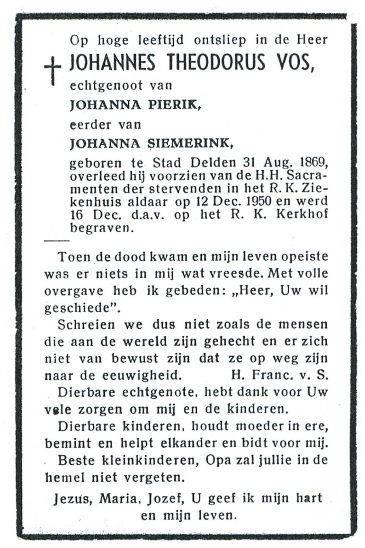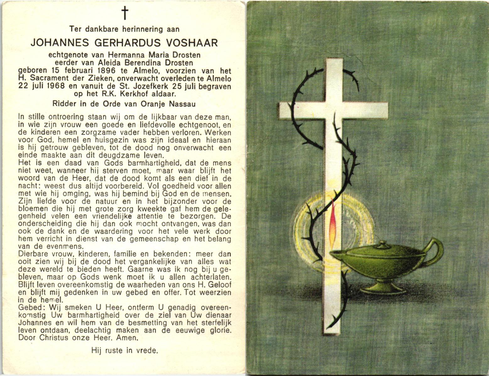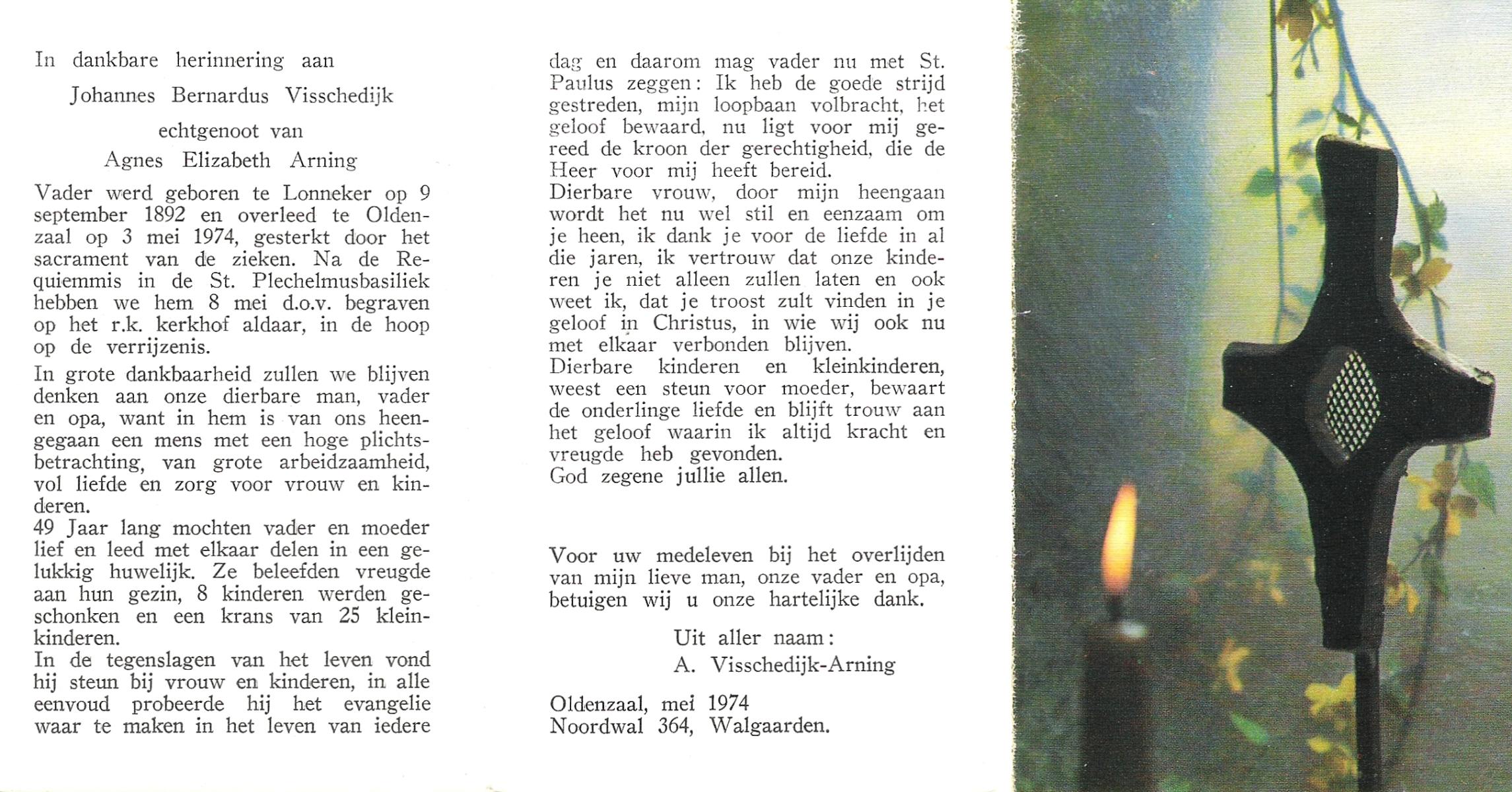VISSCHEDIJK, Johannes Bernardus, geboren op 09-09-1892 te Lonneker, overleden op 3-5-1974 te Oldenzaal op 81-jarige leeftijd, begraven op 8-5-1974 te Oldenzaal.