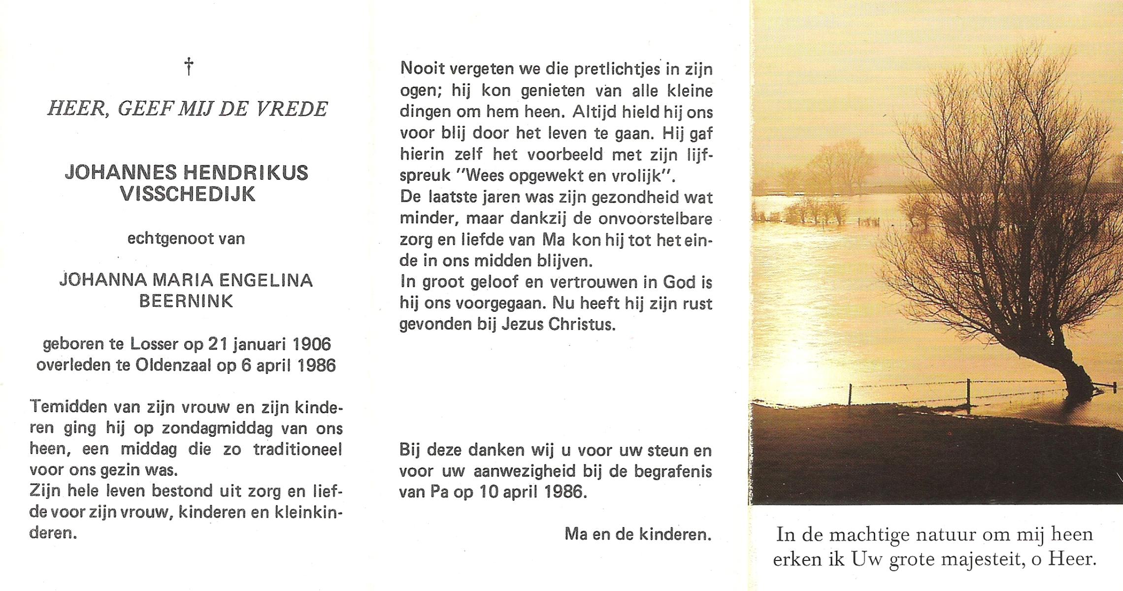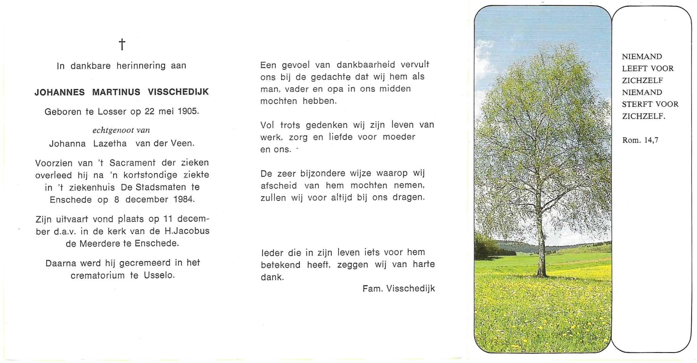 VISSCHEDIJK, Johannes Martinus, geboren op 22-5-1905 te Losser, overleden op 8-12-1984 te Enschede op 79-jarige leeftijd, gecremeerd op 11-12-1984 te Usselo.