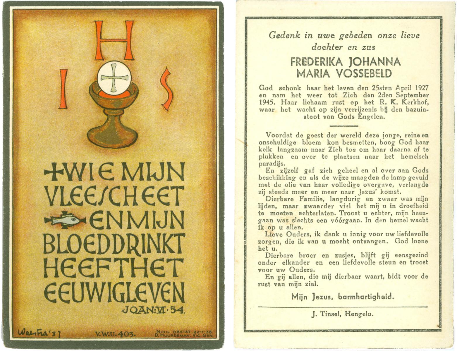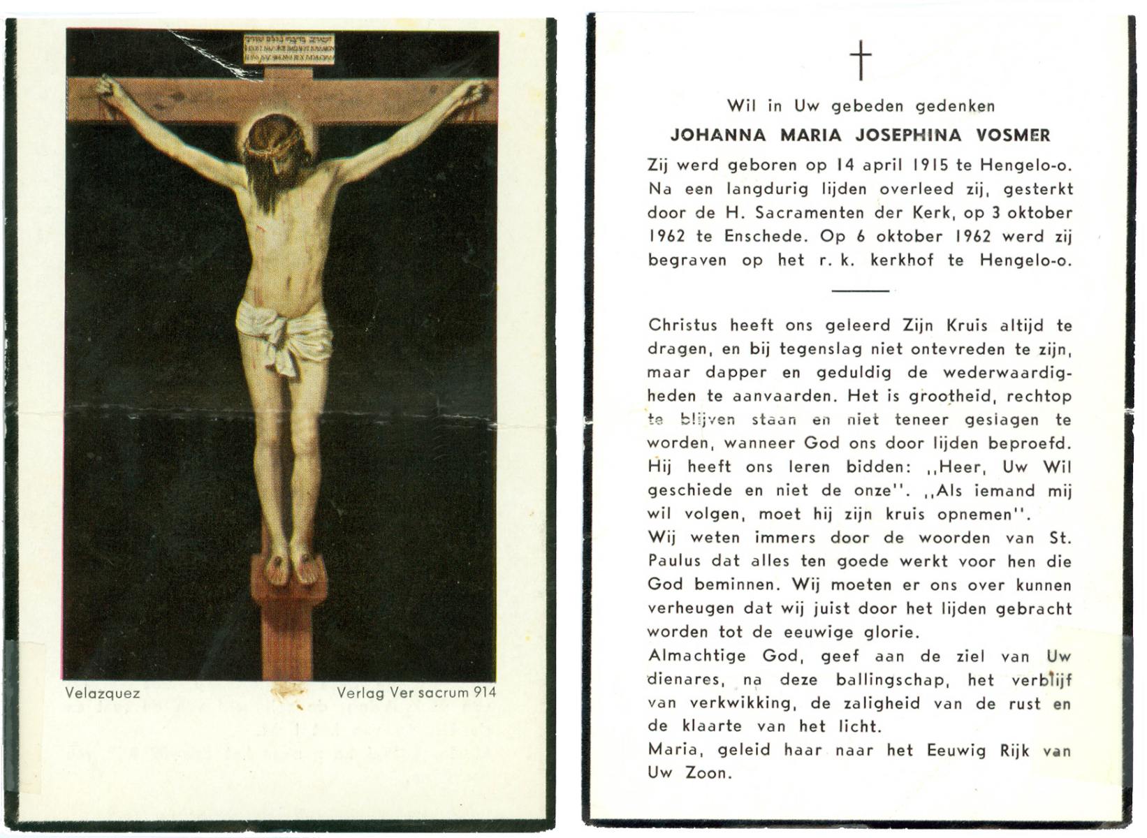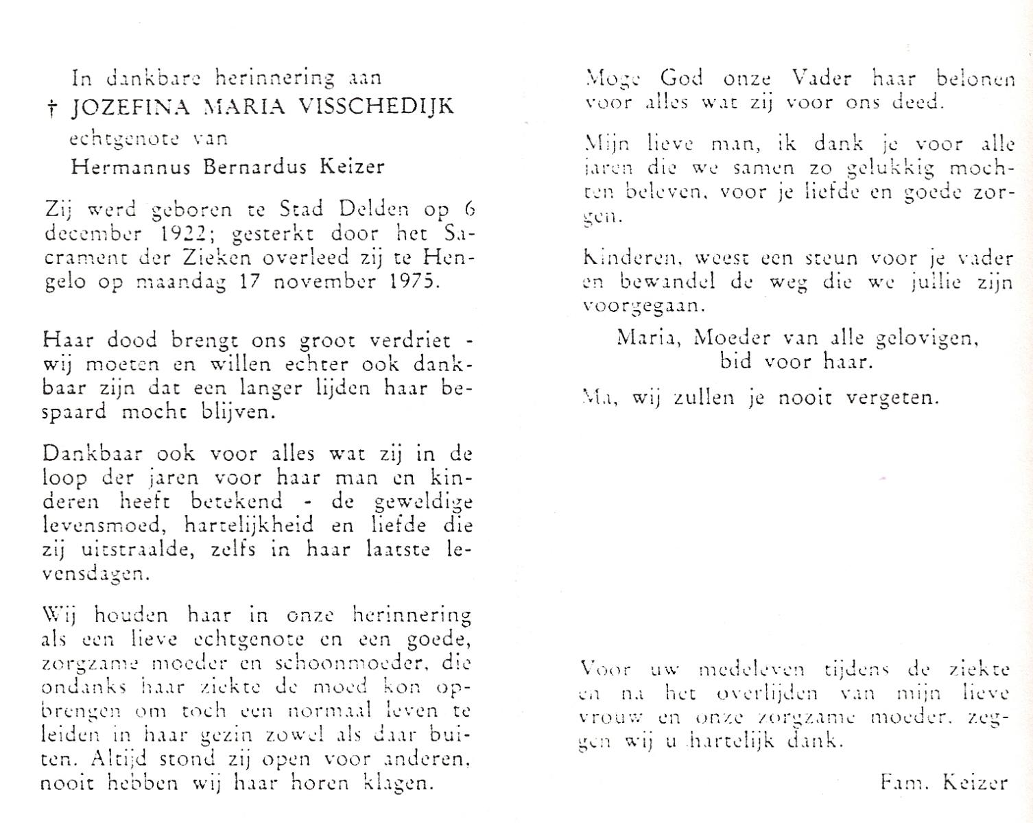VISSCHEDIJK, Jozefina Maria, geboren op 6-12-1922 te Delden, Stad, overleden op 17-11-1975 te Hengelo (Ov.) op 52-jarige leeftijd.