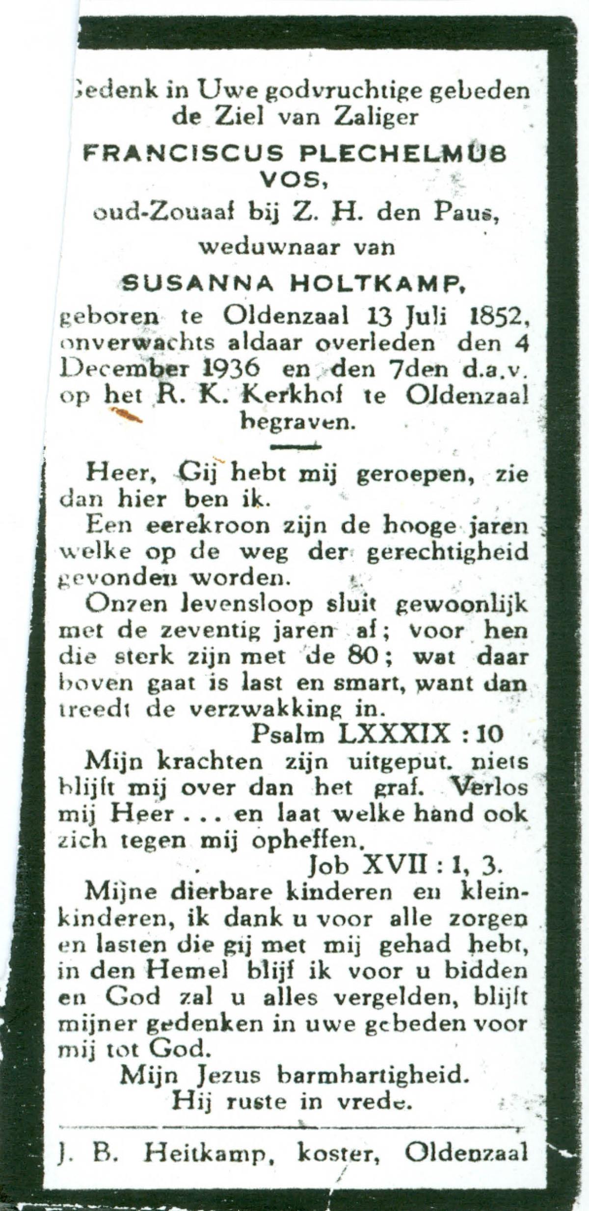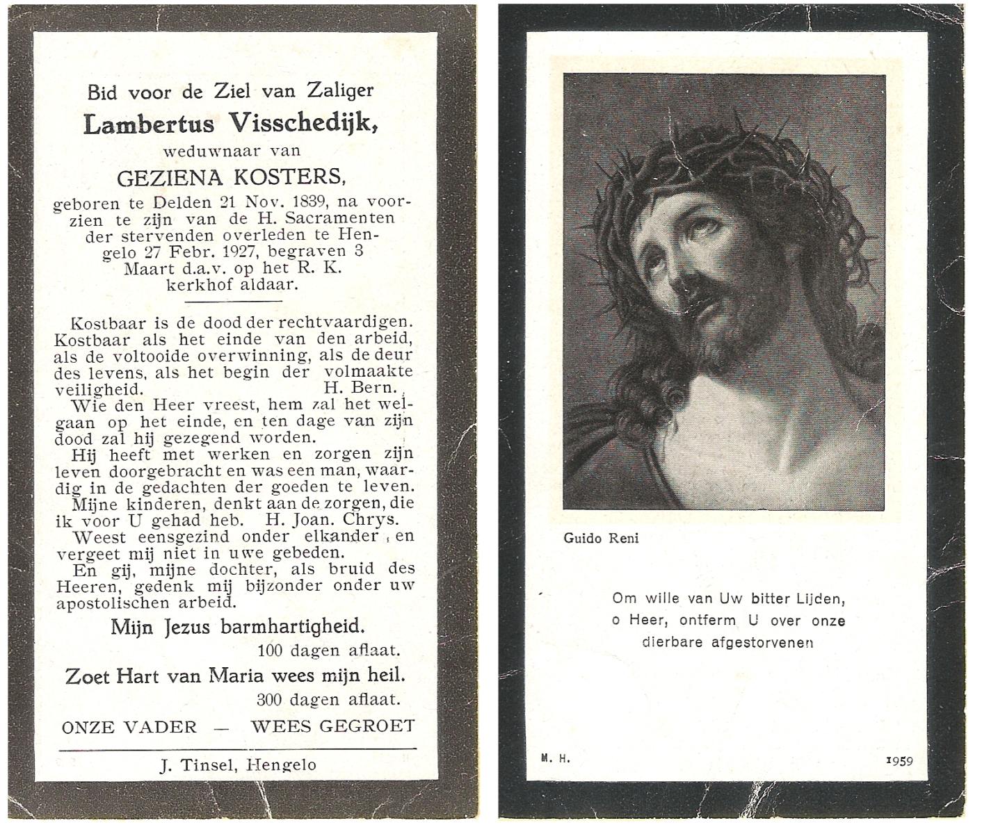 VISSCHEDIJK, Lambertus, geboren op 21-11-1839 te Delden, overleden op 27-2-1929 te Hengelo (Ov.) op 89-jarige leeftijd, begraven op 3-3-1929 te Hengelo (Ov.).