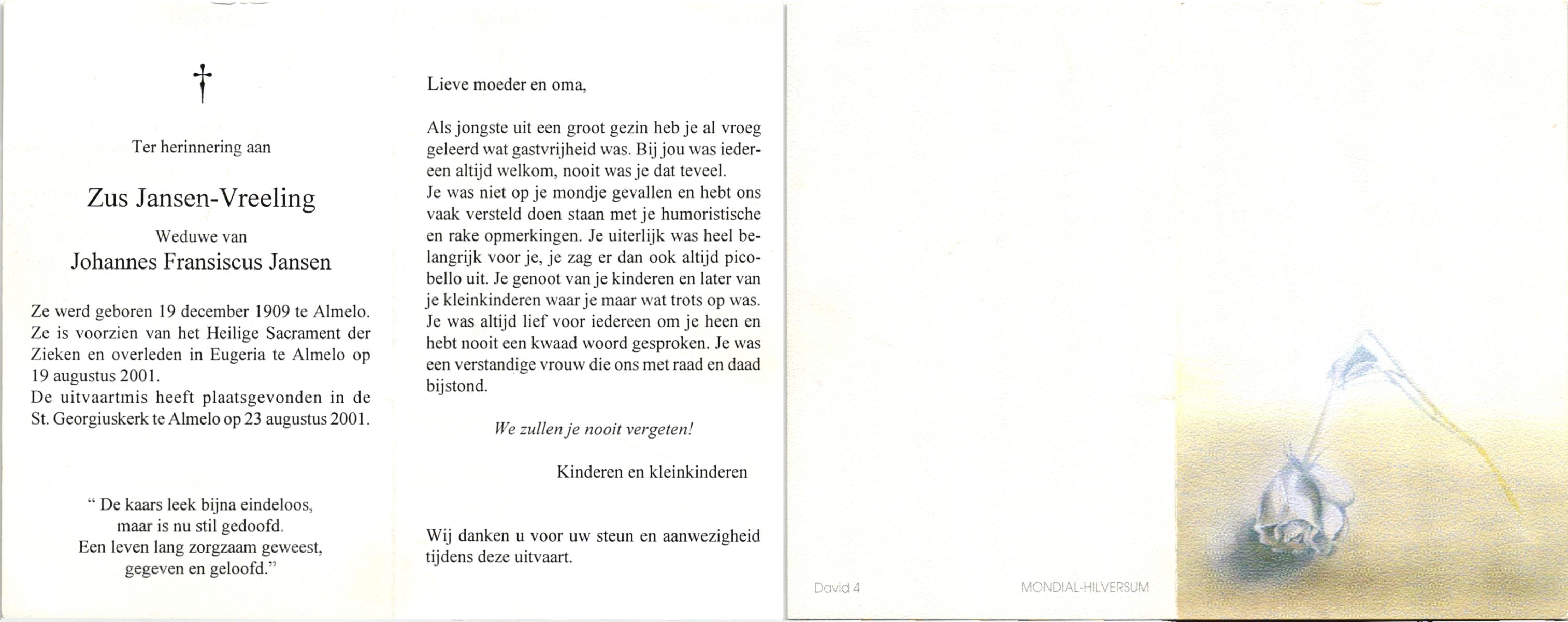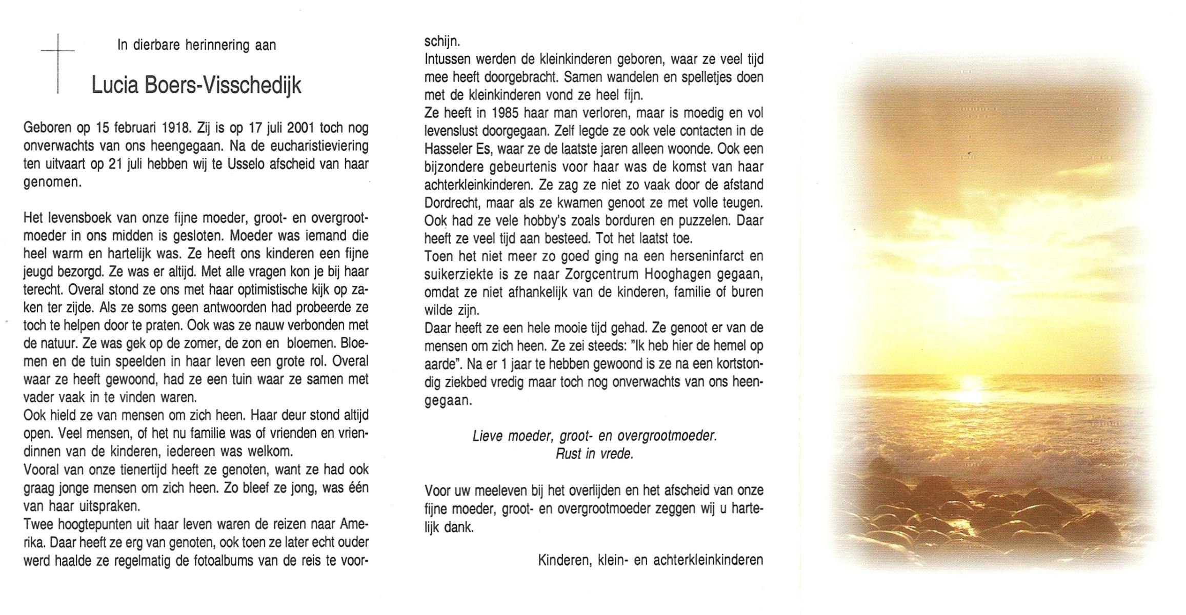 VISSCHEDIJK, Lucia, geboren op 15-2-1918, overleden op 17-7-2001 op 83-jarige leeftijd, gecremeerd op 21-7-2001 te Usselo.